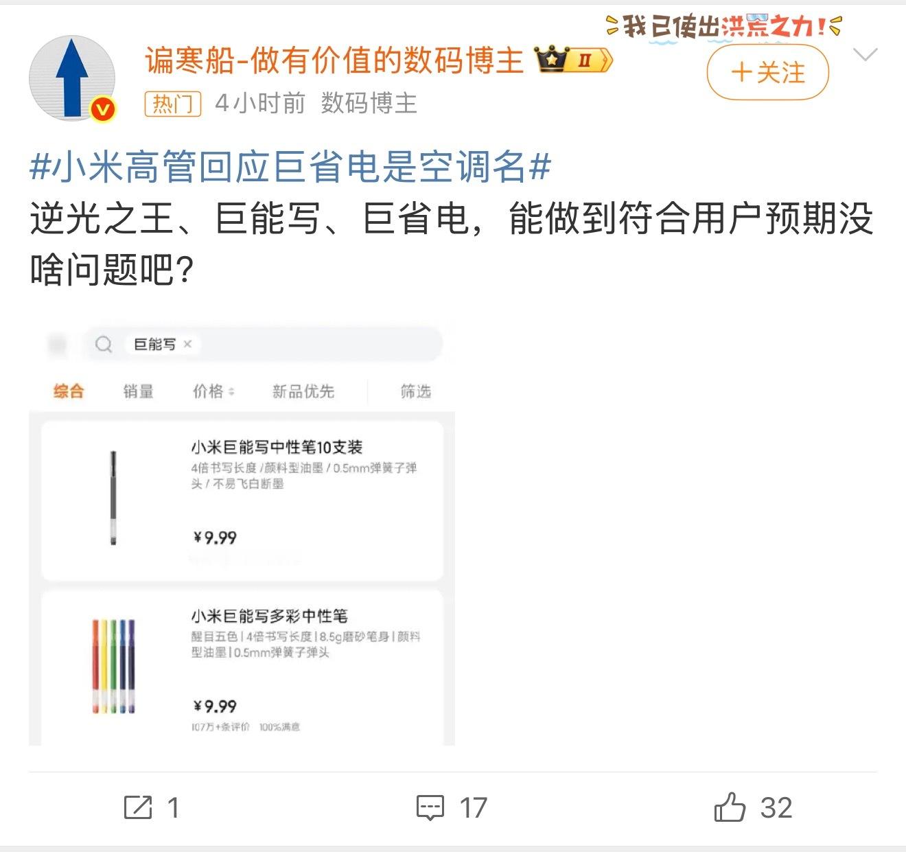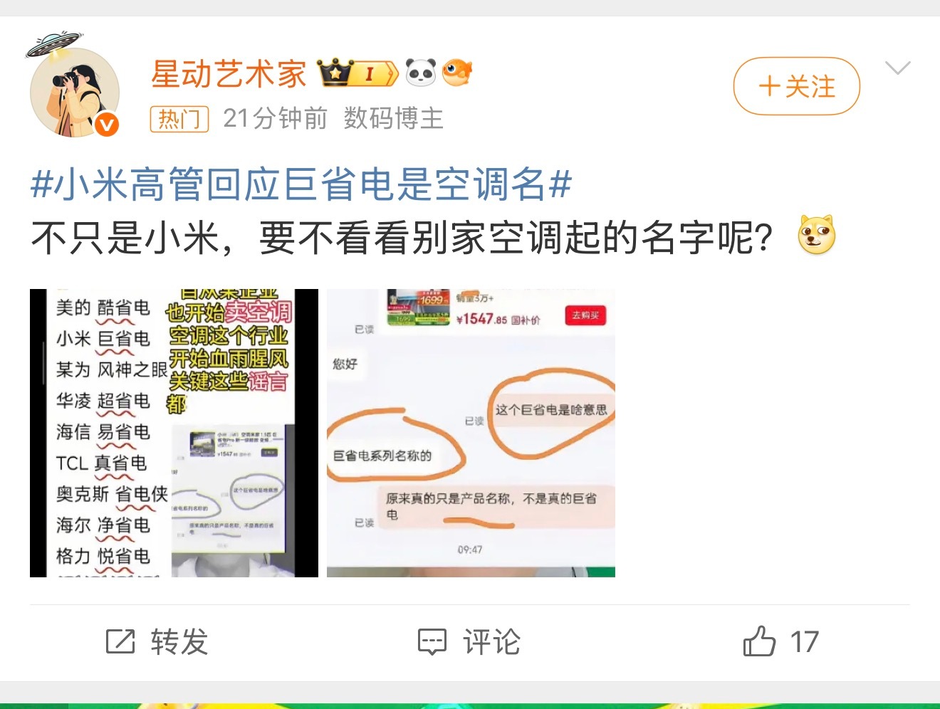 小米高管回应巨省电是空调名其实叫巨啥都没毛病,只要产品做的好,起个名字啥的都可以理解。