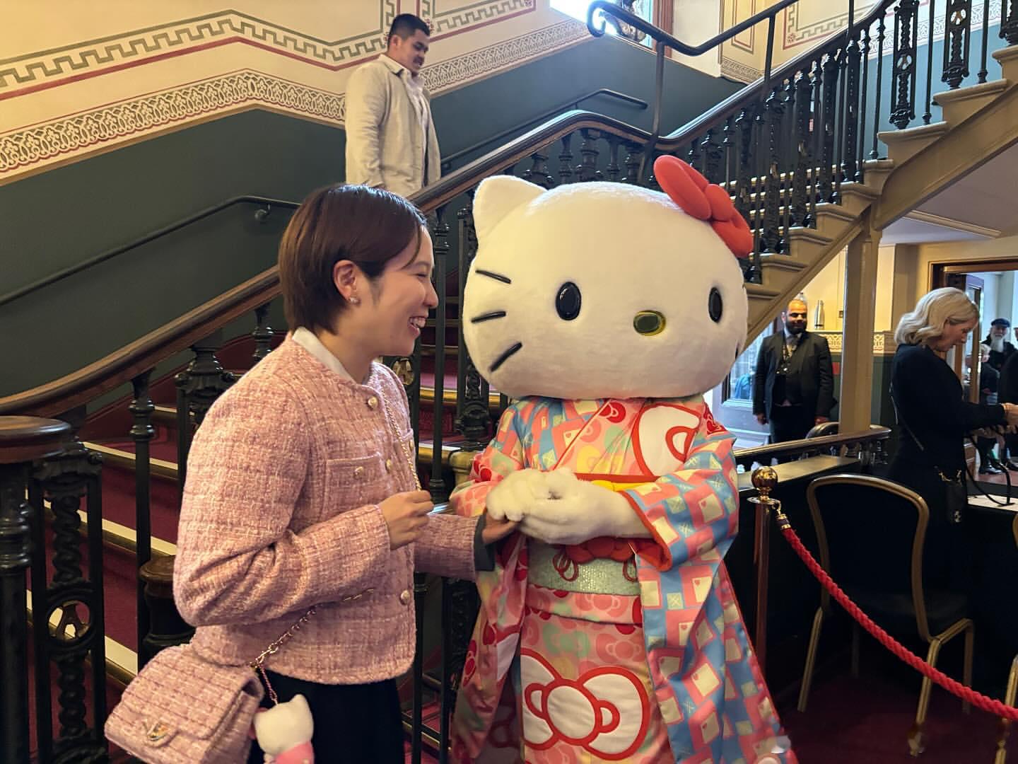 平野美宇:在伦敦大相扑公演中,遇到了最喜欢的HelloKitty!!💖可爱,一生的推!衣服的颜色很配,真的好开心😭还想再见面啊~💌