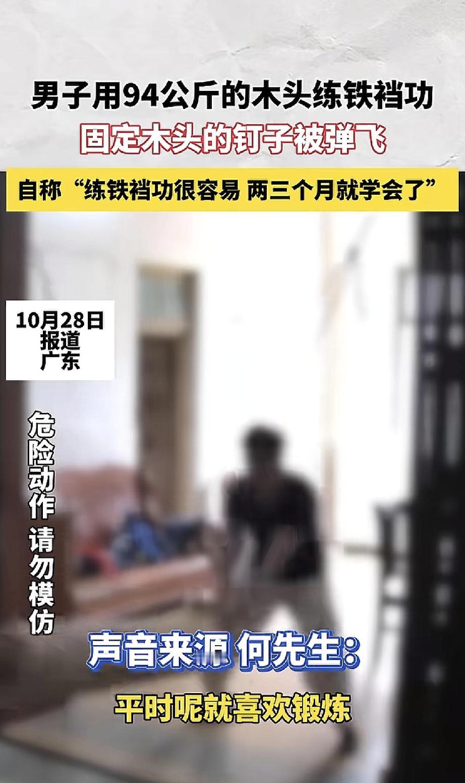 这位大哥的锻炼方式也太硬核了!广东一男子用94公斤重的木头练习“铁档功”,结果固定木头的钉子都被震飞了。 他还自信地说:“练这个很容易,两三个月就学会了。”看得人目瞪口呆。 网友一边觉得佩服,一边直呼肉疼:这简直是“狠人”操作!视频必须加上“请勿模仿”,这要没练好,后果不堪设想,是学会了还是学废了。