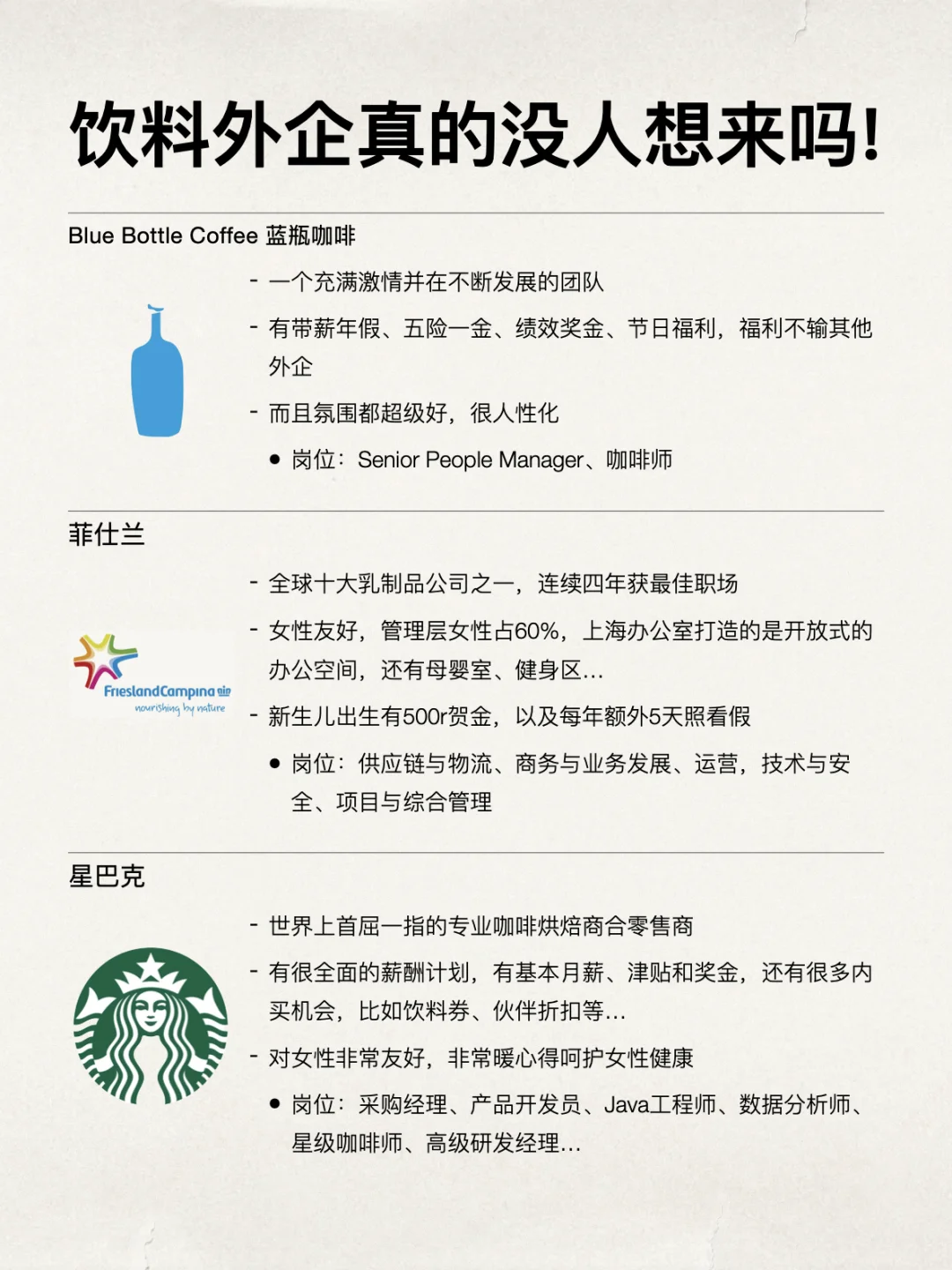 金九银十过半,还不知道投什么的看看饮料外企吧,门槛友好,专业对口度高,很多饮料外企还在持续招人 . 🍹饮料行业品类丰富,乳制品、气泡水、功能饮料、茶饮、果汁…覆盖生活全场景,岗位超多,研发、品控、供应链、市场营销…总有一个适合你 . 外企福利待遇也是真的好 🎯无996,年假15天起步,病假也大方,弹性工作不打卡,居家办公灵活自由,五险一金足额缴,补充医保覆盖全面,氛围轻松,对女性友好,注重WLB . 坚持日更✊🏻,帮大家在找工作路上顺利拿到offer! .