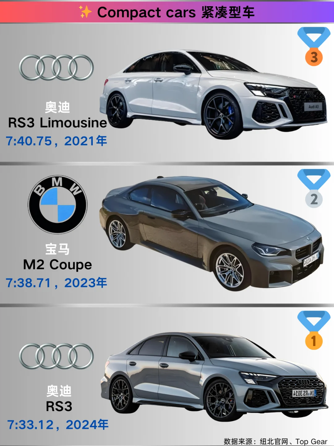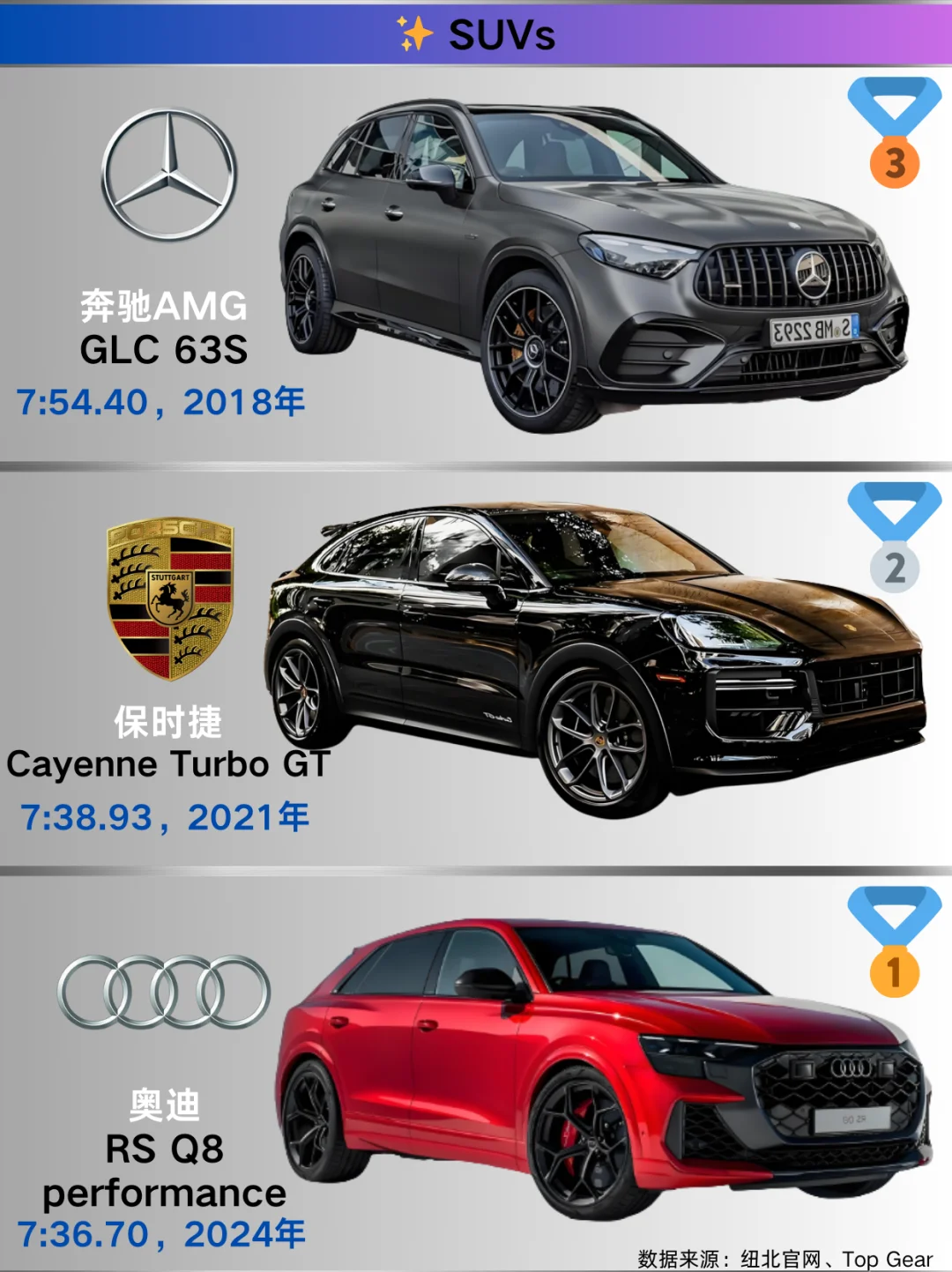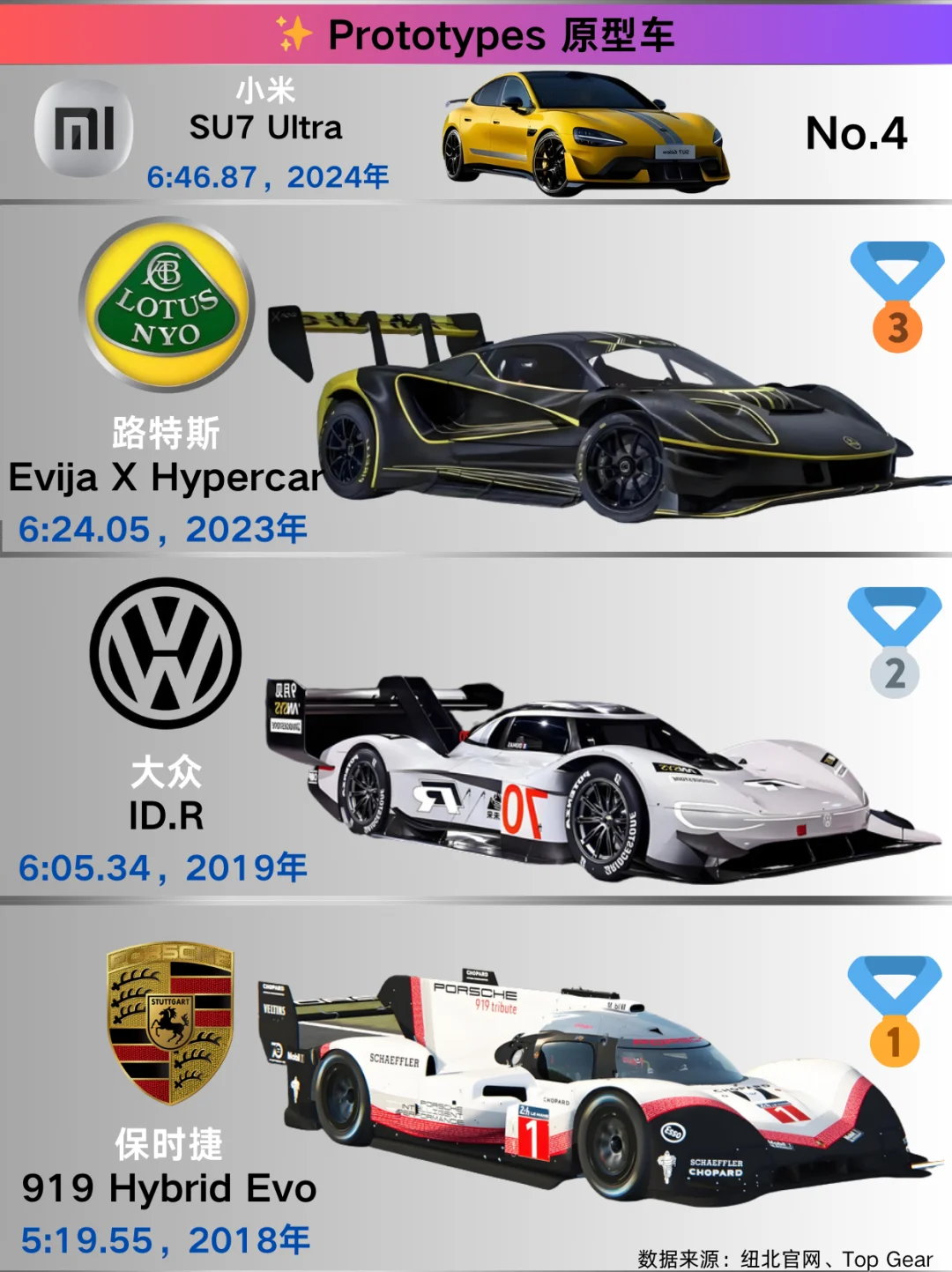跑车 🥇奔驰AMG ONE:2024年以6:29.09称雄。作为F1技术民用化的典范,混动系统带来超强爆发力,在赛道上一骑绝尘。 🥈保时捷911 GT2 RS MR:2021年圈速6:43.30 。经典911的高性能版,后置后驱布局搭配强劲动力,操控与速度完美融合。 🥉奔驰AMG GT Black Series:2020年跑出6:48.05 。 紧凑型车 🥇奥迪RS3:2024年凭借7:33.12夺冠。2.5T发动机搭配四驱系统,小钢炮之名当之无愧,驾驶激情满格。 🥈宝马M2 Coupe:2023年以7:38.71位居次席。紧凑车身内是宝马出色的操控调校与动力输出。 🥉奥迪RS3 Limousine:2021年圈速7:40.75 。 中型车 🥇宝马M4 CSL:2023年以7:18.14拔得头筹。轻量化设计结合高性能发动机,传承宝马赛道精神。 🥈捷豹XE SV Project 8:2019年圈速7:23.16 ,独特设计与强大动力,是捷豹的性能猛兽。 🥉宝马M3 CS:2023年跑出7:28.76 ,宝马经典车型的高性能版本,操控精准,动力强劲。 豪华车 🥇保时捷Panamera Turbo S E-Hybrid:2024年以7:24.17夺冠。豪华与性能兼备,混动系统让动力更澎湃。 🥈奔驰AMG GT 63 S 4MATIC+:2020年圈速7:27.80 ,奔驰豪华性能旗舰,舒适与速度并存。 🥉保时捷Panamera Turbo S:2020年以7:29.81位列第三。 SUV 🥇奥迪RS Q8 performance:2024年以7:36.70登顶。 🥈保时捷Cayenne Turbo GT:2021年圈速7:38.93 ,保时捷SUV性能担当,赛道基因赋予优秀操控与动力。 🥉奔驰AMG GLC 63S:2018年跑出7:54.40 ,将豪华与性能完美融合。 原型车 🥇保时捷919 Hybrid Evo:2018年以5:19.55的惊人成绩称霸。勒芒赛场常胜将军,混动技术强大,动力回收与输出卓越。 🥈大众ID.R:2019年圈速6:05.34 。 🥉路特斯Evija X Hypercar:2023年以6:24.05上榜,超跑级空气动力学设计与强大动力,尽显路特斯赛道底蕴。 小米SU7 Ultra:2024年以6:46.87展现实力。 纯电车 🥇锐马克Nevera:2023年以7:05.30夺冠。四电机四驱提供超强扭矩,电动超跑新星,加速迅猛。 🥈保时捷Taycan Turbo GT with Weissach package:2023年圈速7:07.55 ,保时捷电动跑车代表,兼顾日常与赛道性能。 🥉保时捷Taycan Turbo S:2023年以7:33.35位列第三。 德国主场优势:保时捷/奔驰/宝马常年屠榜!
