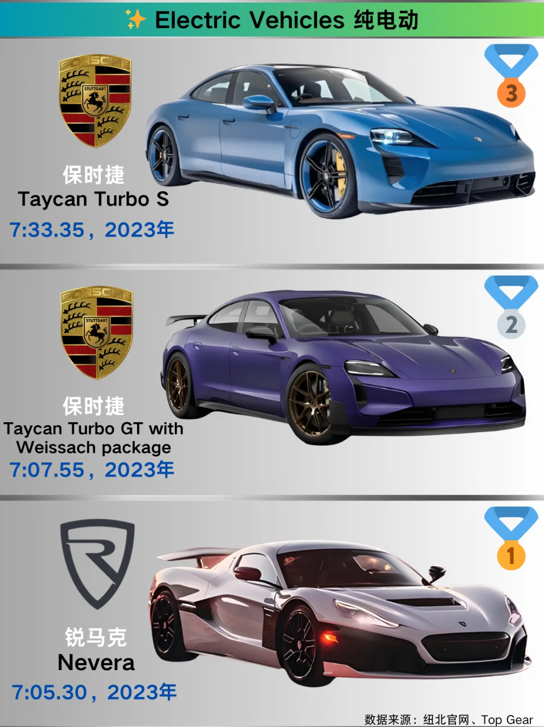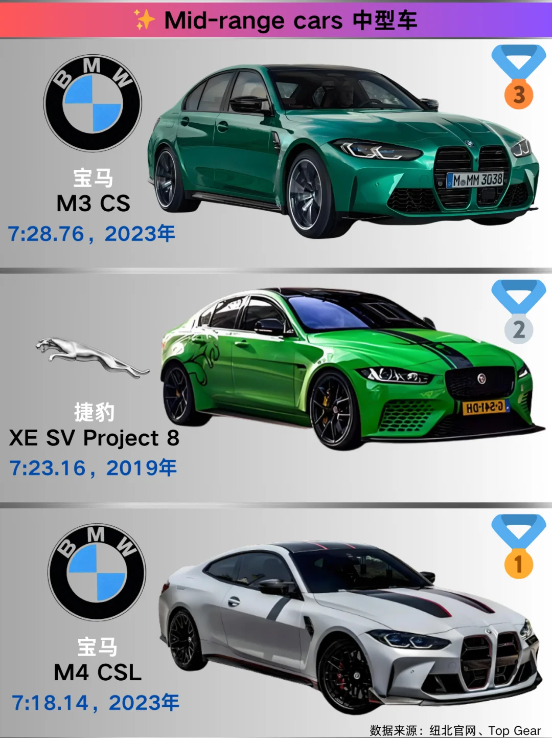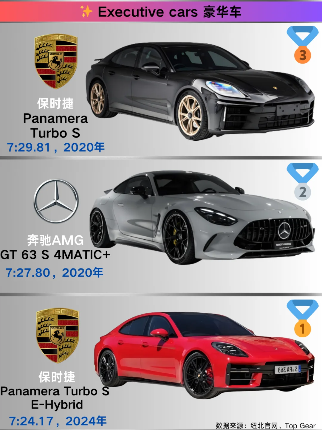 跑车 🥇奔驰AMG ONE:2024年以6:29.09称雄。作为F1技术民用化的典范,混动系统带来超强爆发力,在赛道上一骑绝尘。 🥈保时捷911 GT2 RS MR:2021年圈速6:43.30 。经典911的高性能版,后置后驱布局搭配强劲动力,操控与速度完美融合。 🥉奔驰AMG GT Black Series:2020年跑出6:48.05 。 紧凑型车 🥇奥迪RS3:2024年凭借7:33.12夺冠。2.5T发动机搭配四驱系统,小钢炮之名当之无愧,驾驶激情满格。 🥈宝马M2 Coupe:2023年以7:38.71位居次席。紧凑车身内是宝马出色的操控调校与动力输出。 🥉奥迪RS3 Limousine:2021年圈速7:40.75 。 中型车 🥇宝马M4 CSL:2023年以7:18.14拔得头筹。轻量化设计结合高性能发动机,传承宝马赛道精神。 🥈捷豹XE SV Project 8:2019年圈速7:23.16 ,独特设计与强大动力,是捷豹的性能猛兽。 🥉宝马M3 CS:2023年跑出7:28.76 ,宝马经典车型的高性能版本,操控精准,动力强劲。 豪华车 🥇保时捷Panamera Turbo S E-Hybrid:2024年以7:24.17夺冠。豪华与性能兼备,混动系统让动力更澎湃。 🥈奔驰AMG GT 63 S 4MATIC+:2020年圈速7:27.80 ,奔驰豪华性能旗舰,舒适与速度并存。 🥉保时捷Panamera Turbo S:2020年以7:29.81位列第三。 SUV 🥇奥迪RS Q8 performance:2024年以7:36.70登顶。 🥈保时捷Cayenne Turbo GT:2021年圈速7:38.93 ,保时捷SUV性能担当,赛道基因赋予优秀操控与动力。 🥉奔驰AMG GLC 63S:2018年跑出7:54.40 ,将豪华与性能完美融合。 原型车 🥇保时捷919 Hybrid Evo:2018年以5:19.55的惊人成绩称霸。勒芒赛场常胜将军,混动技术强大,动力回收与输出卓越。 🥈大众ID.R:2019年圈速6:05.34 。 🥉路特斯Evija X Hypercar:2023年以6:24.05上榜,超跑级空气动力学设计与强大动力,尽显路特斯赛道底蕴。 小米SU7 Ultra:2024年以6:46.87展现实力。 纯电车 🥇锐马克Nevera:2023年以7:05.30夺冠。四电机四驱提供超强扭矩,电动超跑新星,加速迅猛。 🥈保时捷Taycan Turbo GT with Weissach package:2023年圈速7:07.55 ,保时捷电动跑车代表,兼顾日常与赛道性能。 🥉保时捷Taycan Turbo S:2023年以7:33.35位列第三。 德国主场优势:保时捷/奔驰/宝马常年屠榜!