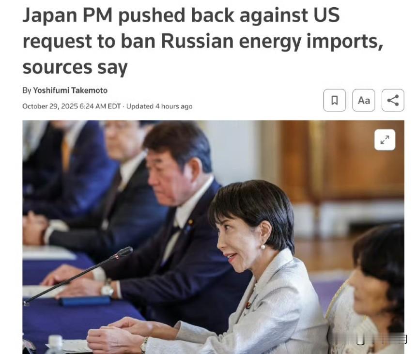 日本首相高市早苗拒绝了美国要求禁止进口俄罗斯能源的要求 两名日本政府官员周三告诉路透社,日本新任首相高市早苗在东京与美国总统特朗普会晤时表示,禁止进口俄罗斯液化天然气将很困难。高市寻求特朗普对日本能源需求的理解。 俄罗斯的液化天然气供应量占日本液化天然气进口总量的近9%,日本公司三井物产持有俄罗斯远东地区萨哈林-2液化天然气项目的股份。