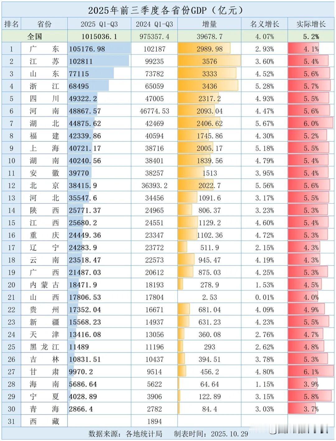 截至10月29日,除西藏外,其他省份2025年前三季度GDP的数据均已公开。 广东、江苏总量超10万亿,领跑全国。增速上,甘肃以6.1%暂居榜首,20个省份跑赢全国5.2%的平均增速。十强省份格局稳定,山东距10万亿一步之遥,经济发展态势备受关注。