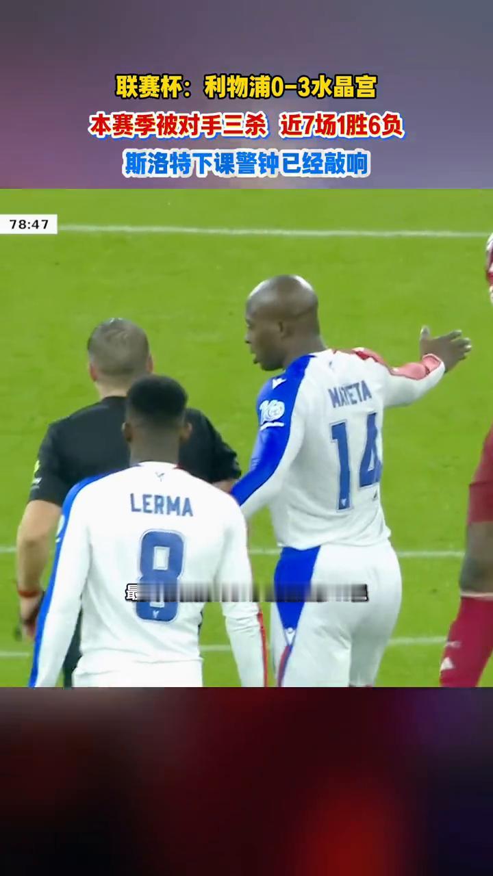联赛杯:利物浦0-3水晶宫,本赛季被对手三杀近7场1胜6负,斯洛特下课警钟已经敲响。 联赛杯第4轮,利物浦坐镇主场安菲尔德迎战水晶宫。本场比赛利物浦大轮换,派出大部分青年军出战,最终比赛没啥悬念,利物浦0比3输给水晶宫。 上半场基耶萨错失良机后萨尔梅开二度,易边再战纳洛染红利物浦10人作战,皮诺再下一城杀死比赛,最终利物浦0比3水晶宫止步16强。从社区盾杯到联赛再到杯赛被水晶宫三杀,最近7场比赛更是1胜6负,照这么下去利物浦换帅没悬念了。