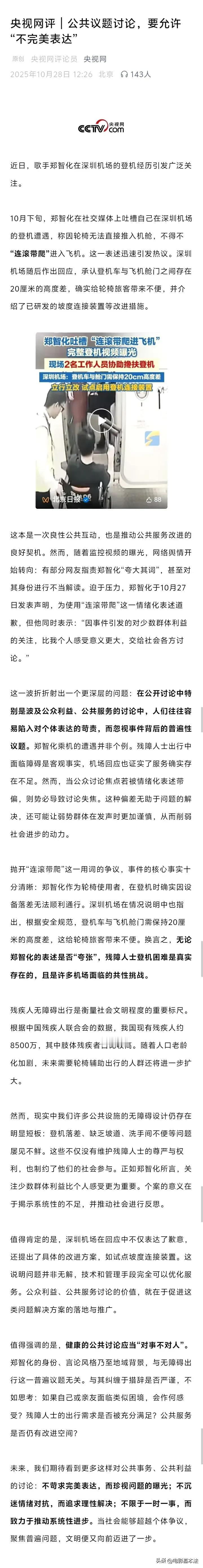 央煤发声 允许不完美表达 可这明明就是看人下菜碟 他是不完美表达吗? 开始不是说深圳机场没人性吗 没人性是一定程度上的攻击了吧 实际上有多个工作人员帮忙了 如果这是一个普通人这样发声 央媒会这样说吗
