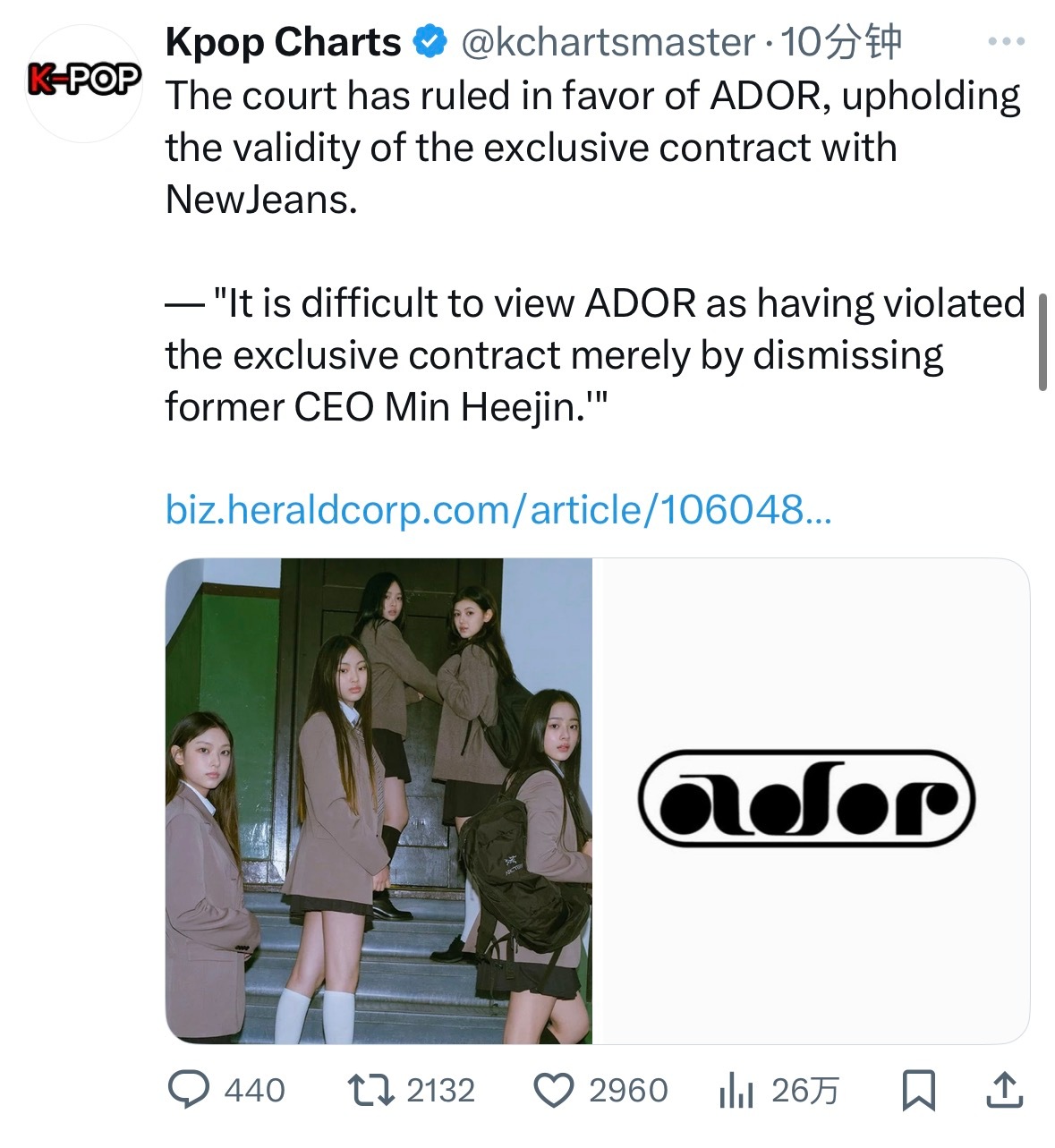 据报道,法院已裁定 ADOR 胜诉,维持了与 NewJeans 签订的独家合同的