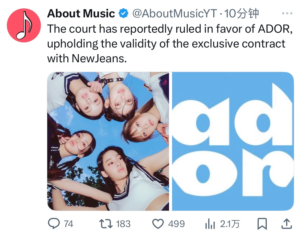 据报道,法院已裁定ADOR胜诉,维持了与NewJeans签订的独家合同的