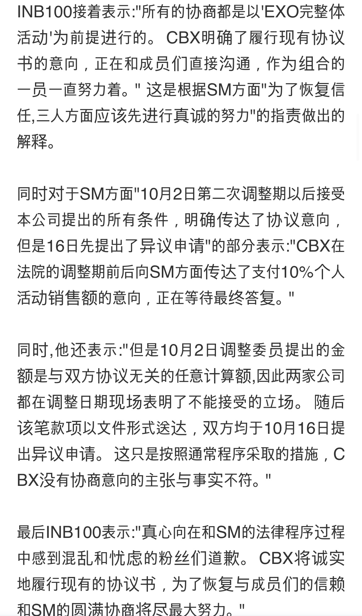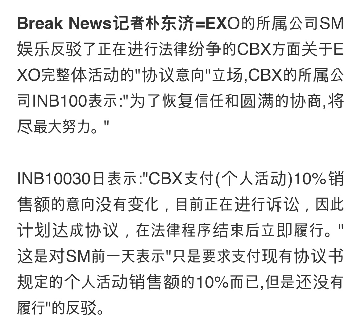 今早,CBX方反驳sm了CBX方回应SMCBX方希望与EXO恢复信任