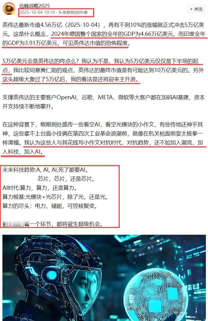 “全球股王”达子市值突破5万亿美元,这是全球人工智能的大事,有人说达子再好是人家的事,你有什么好高兴的。这种割裂的眼光一看就是千年的老登,他们永远不会明白达子每上一个台阶,就会增加A股算力链条,半导体芯片,AI相关板块的概率,胜率和赔率。我的看法和十月初一样,达子这头超级大象过了5万亿后,我的看法是还将迎来主升浪。 昨晚达子新高,AMD新高,博通新高,美光新高,闪迪新高,应用材料,日月光半导体,台积电,阿斯麦等全部上涨,今天的A股依旧会是科技板块的天下。 昨天沪指强势突破4000点,但昨天晚上我发文章泼过冷水了,这里除非券商继续发大力,否则持续上行概率不大,还得围绕4000点上下打转几天,这是必要的,也是好事,不要慌。 四季度的主升浪已经很近很近了,这个位置我的看法即便坐过山车也比没车坐要强,有这样的心态才扛地住波动。