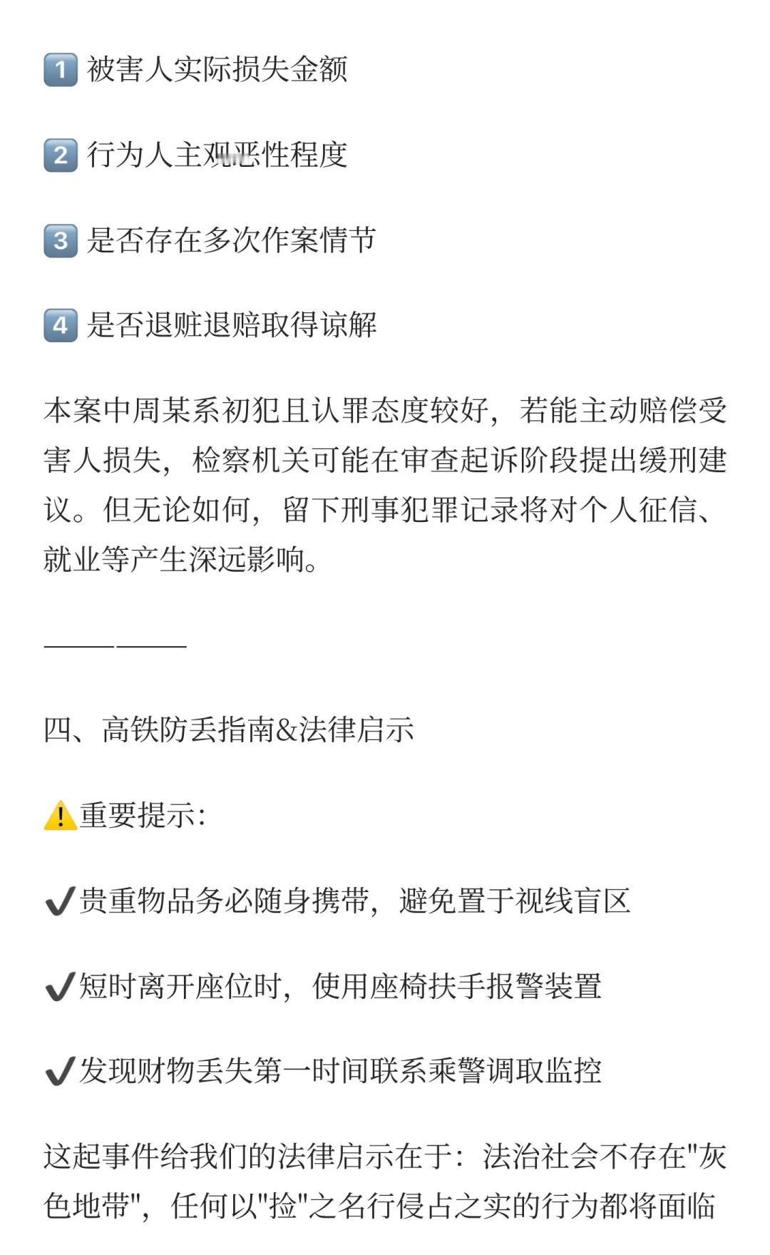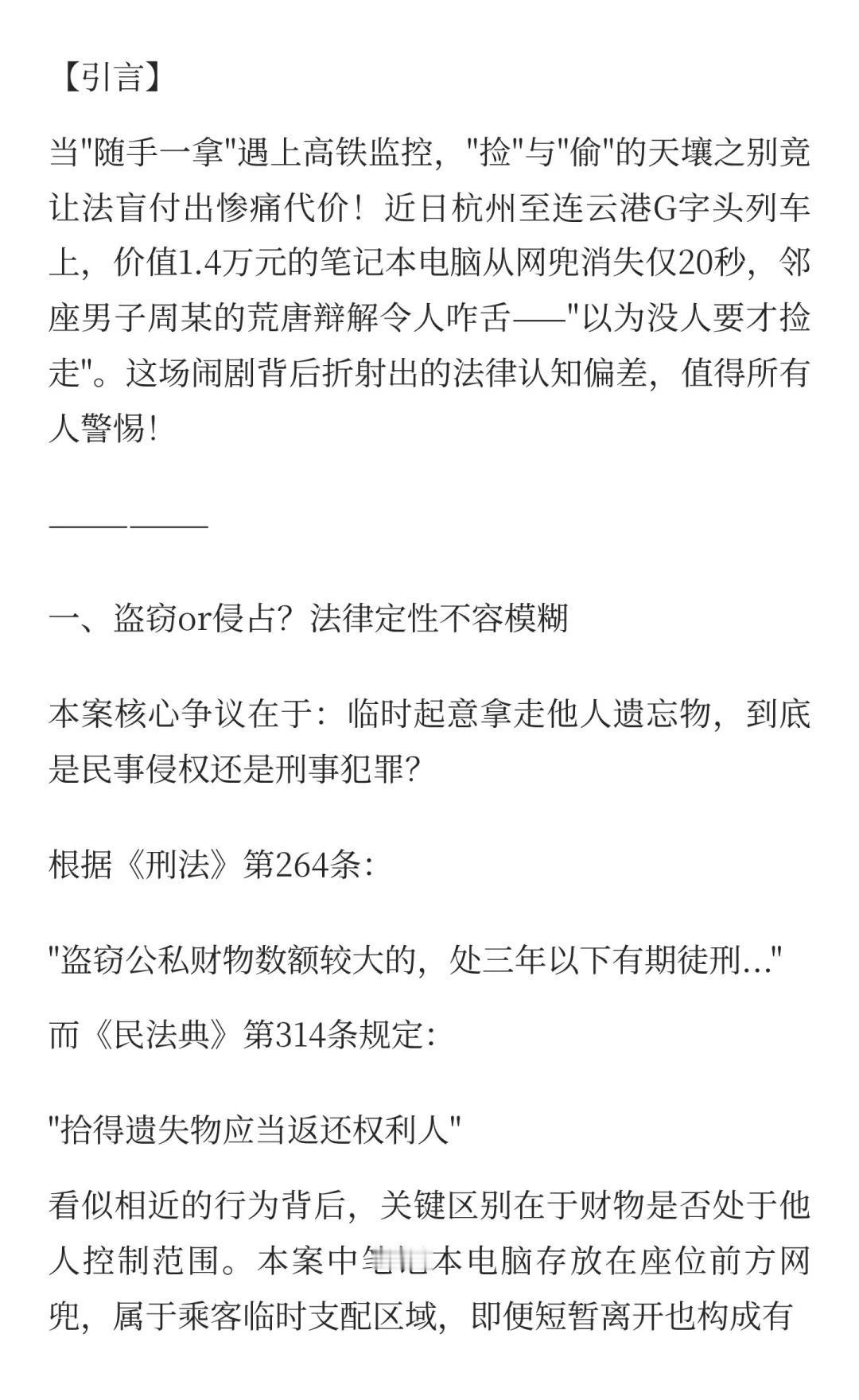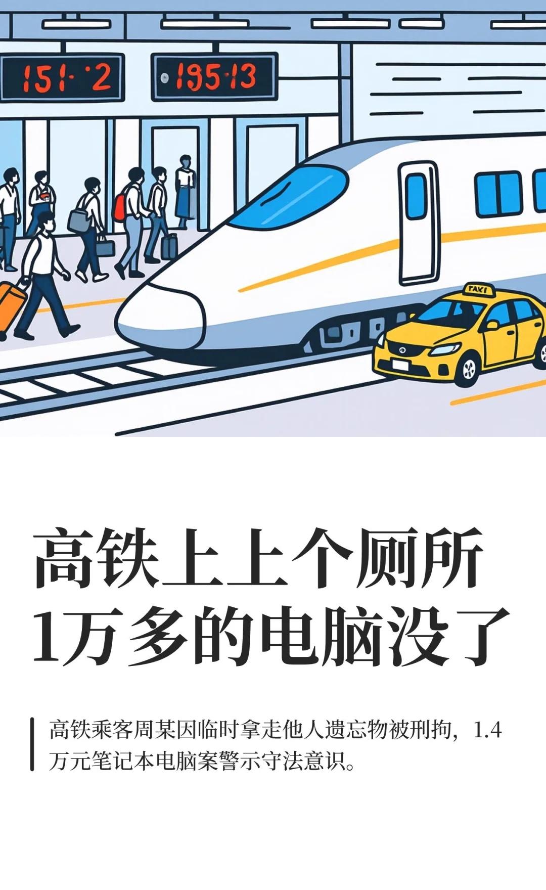 高铁上上个厕所1万多的电脑没了 高铁监控揭示“随手一拿”与“偷”的区别。周某因临时拿走他人遗忘的笔记本电脑,被认定为盗窃罪,因涉案金额超1.4万元,被刑事拘留。事件提醒我们,贵重物品应随身携带,避免临时离开时遗失,维护公共安全与法律秩序。法律 热点 法律咨询 高铁