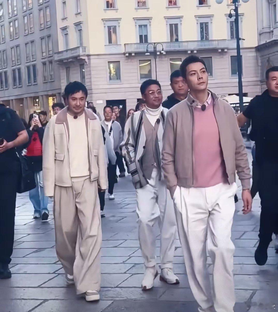 陈伟霆和沈腾,贾冰等人在拍摄《现在就出发3》,三人走在意大利米兰的街头,妥妥老錢风的代表。
