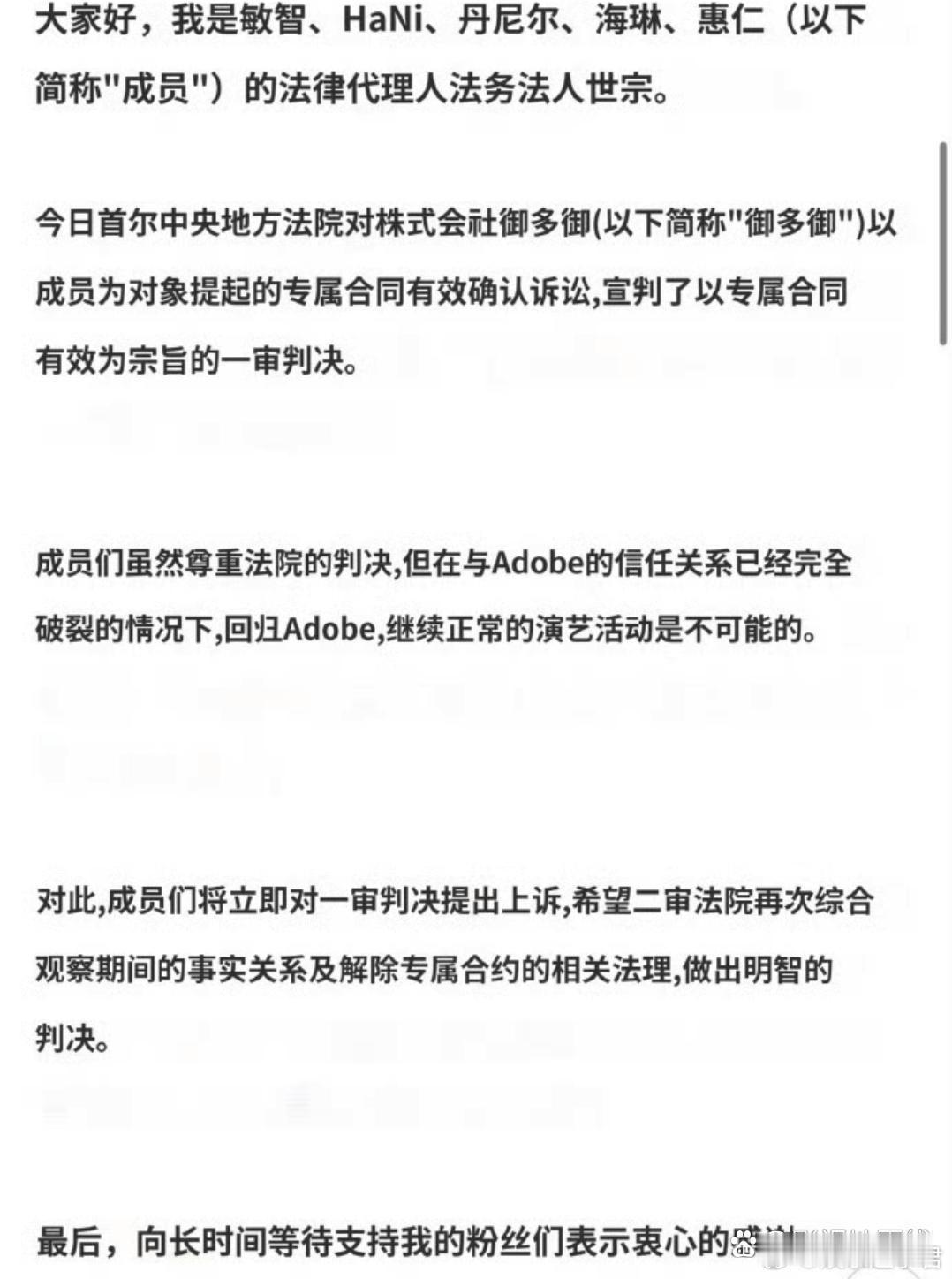 NewJeans终审据韩媒,30日,NewJeans合约被判有效、一审败诉后,Newjeans律师发布声明表示成员们将立即再上诉,“与ADOR的信任关系已完全破裂的情况下,回到ADOR并继续正常的演艺活动是不可能的。”