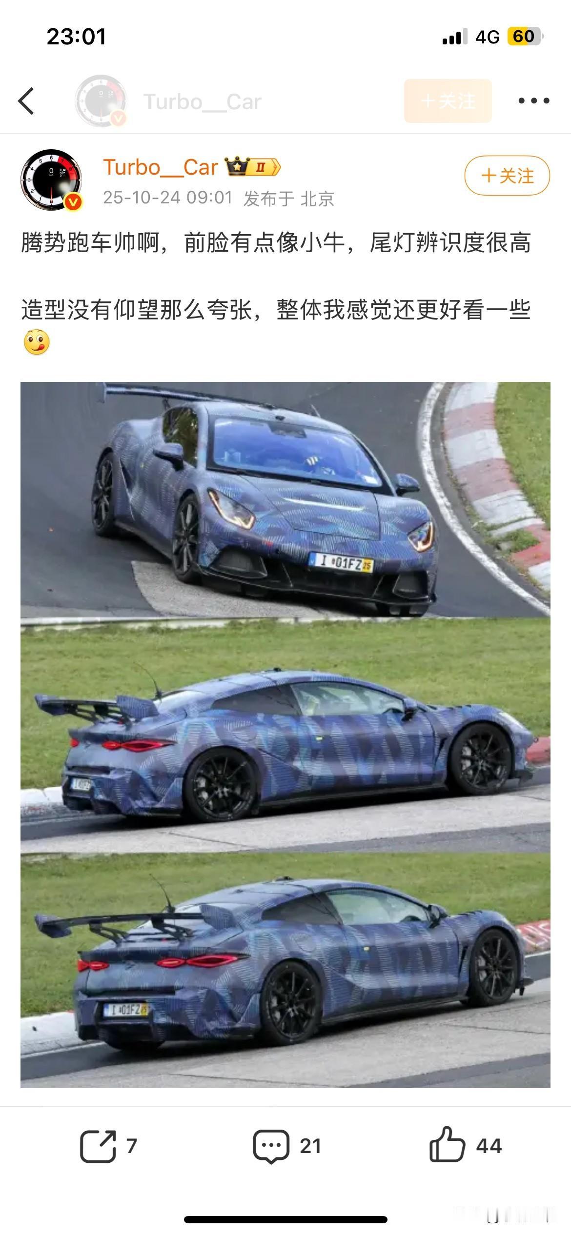 博主:“腾势的跑车帅啊,有点像小牛,造型也没仰望U9那么夸张,整体更好看一点!” 小编只想说,帅那是肯定的,又不是他腾势设计的,他只是拿来主义(方程豹Super9),所以说方程豹的设计还是很在线的!就外观设计来说,在迪家中,方程豹应该是最稳定发挥的一个了!大家觉得呢?