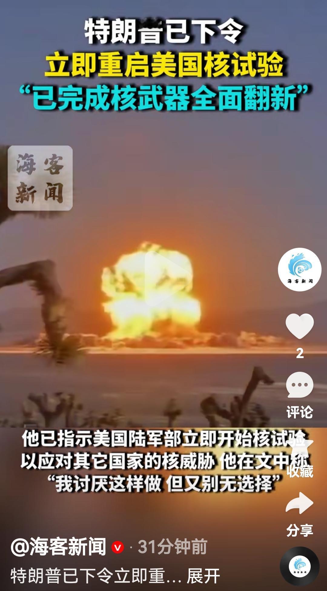 美国总统特朗普下令立即重启美国核实验 根据美国媒体报道,10月30日特朗普在访问韩国时说他已经下令重启核试验 同时他们美国是世界上核武器最多国家,已经完成了全部核武器的翻新 他说我讨厌核武器,但是他别无选择 他已经要求美国陆军开始核试验以应对他国的核威胁 怎么感觉是自己就像这样干,然后说别人威胁他,贼喊捉贼,自己都说自己拥有世界上最大核武器库存,现在又说被人威胁他美国核武器 特朗普韩国 特朗普诺奖梦 美国试射核弹 图片来自海客新闻