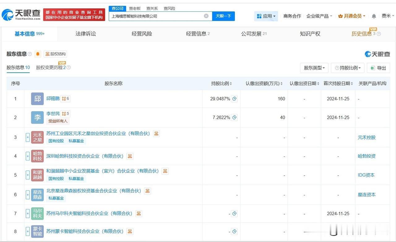 【华为哈勃等入股模思智能】 天眼查App显示,近日,上海模思智能科技有限公司发生工商变更,新增华为旗下深圳哈勃科技投资合伙企业(有限合伙)、蓝耘科技集团股份有限公司等为股东,同时注册资本由500万人民币增至550.8万人民币。 该公司成立于2024年11月,法定代表人为李世民,经营范围包括人工智能基础软件开发、人工智能应用软件开发、人工智能硬件销售等,现由邱锡鹏、李世民及上述新增股东等共同持股。 天眼查信息: