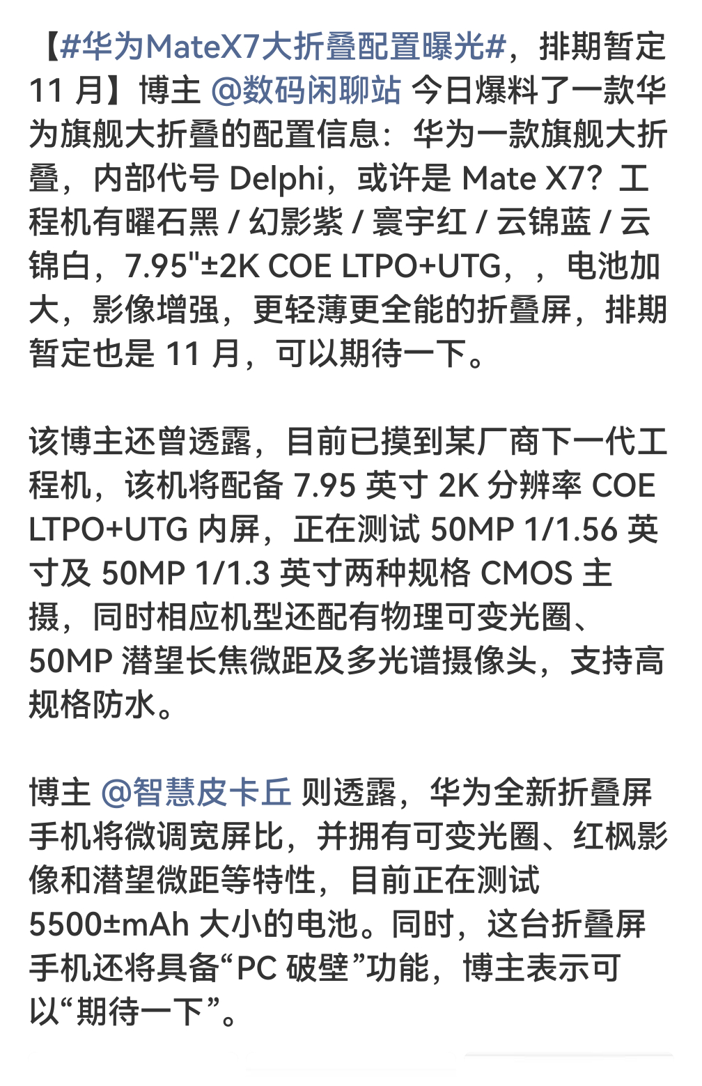 华为MateX7大折叠配置曝光 大折叠的标杆马上要迭代了[点赞] 看起来继续轻薄,持续全能。折叠屏能超越华为的,只有华为[努力]
