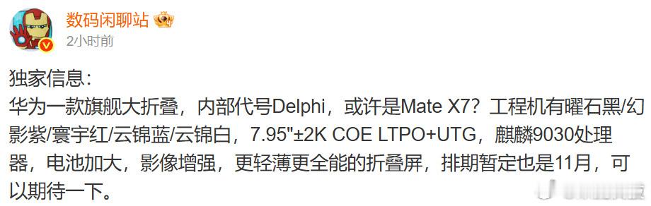 华为MateX7大折叠配置曝光哇,华为新款大折叠华为Mate X7终于要来了!据说新机升级非常多,7.95"±2K COE LTPO+UTG,电池加大,影像增强,再配合鸿蒙6,可以说是更轻薄更全能的折叠屏旗舰了,11月发布,又要买买买的节奏了![打call]