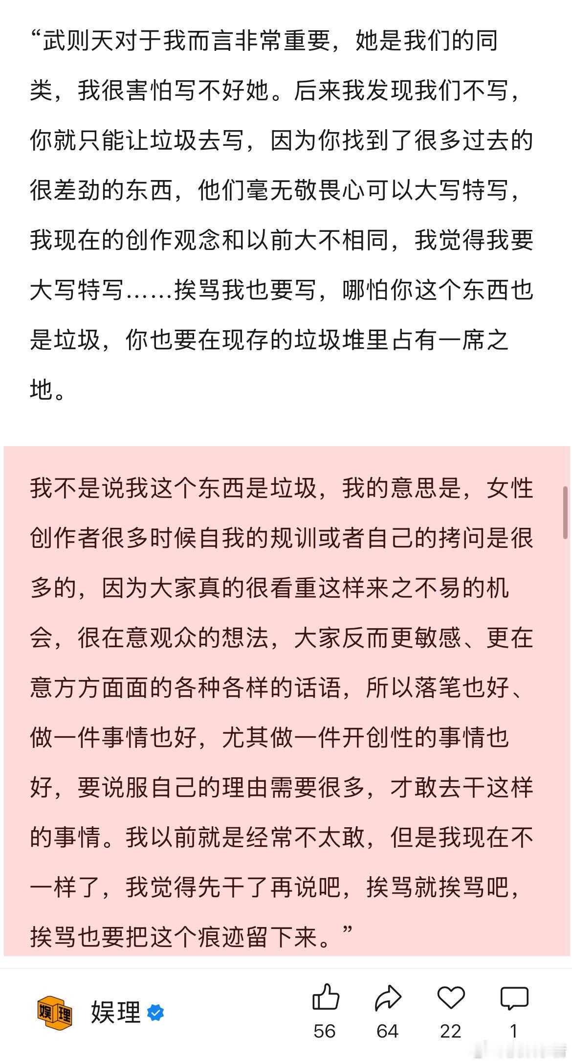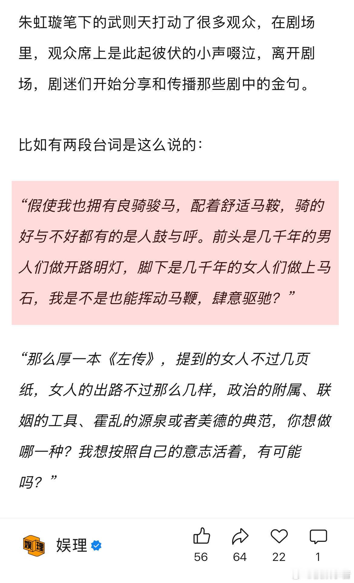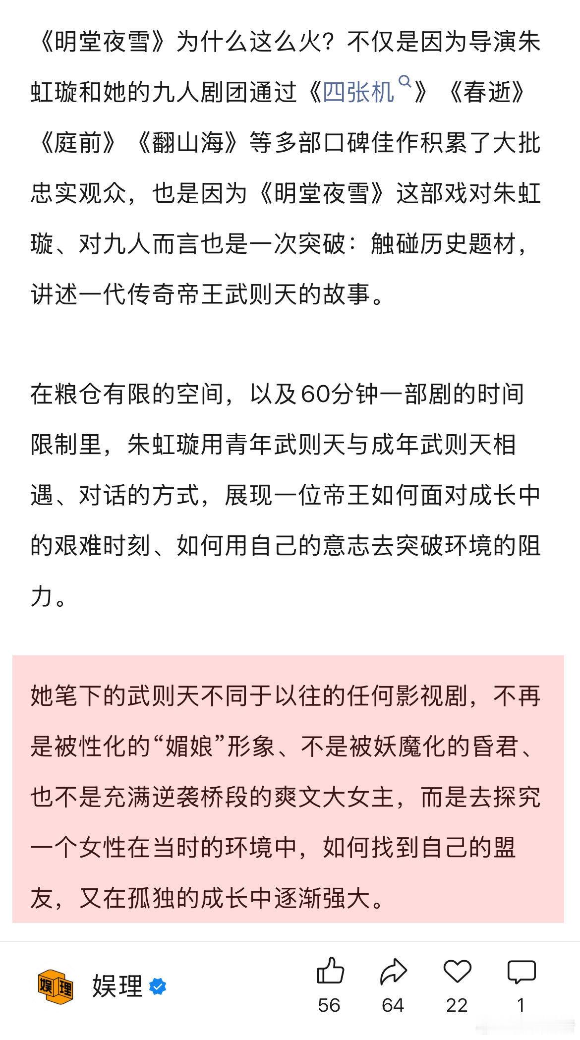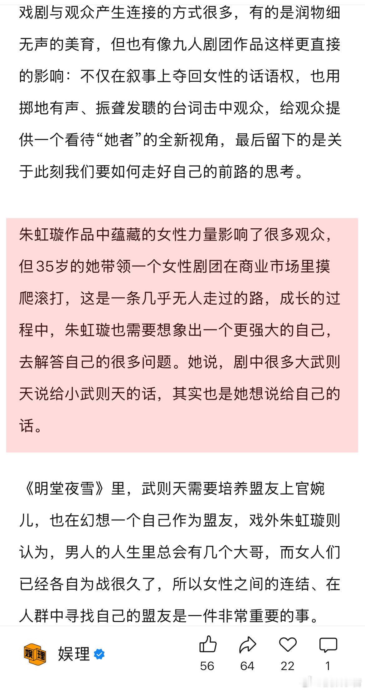 女性创作要让女观众不孤独女性创作者 像野兽一样往前冲 《明堂夜雪》导演朱虹璇,在其作品中蕴藏的女性力量影响了很多观众,但35岁的她带领一个女性剧团在商业市场里摸爬滚打,这是一条几乎无人走过的路,成长的过程中,朱虹璇也需要想象出一个更强大的自己,去解答自己的很多问题。她说,剧中很多大武则天说给小武则天的话,其实也是她想说给自己的话。娱理独家↓