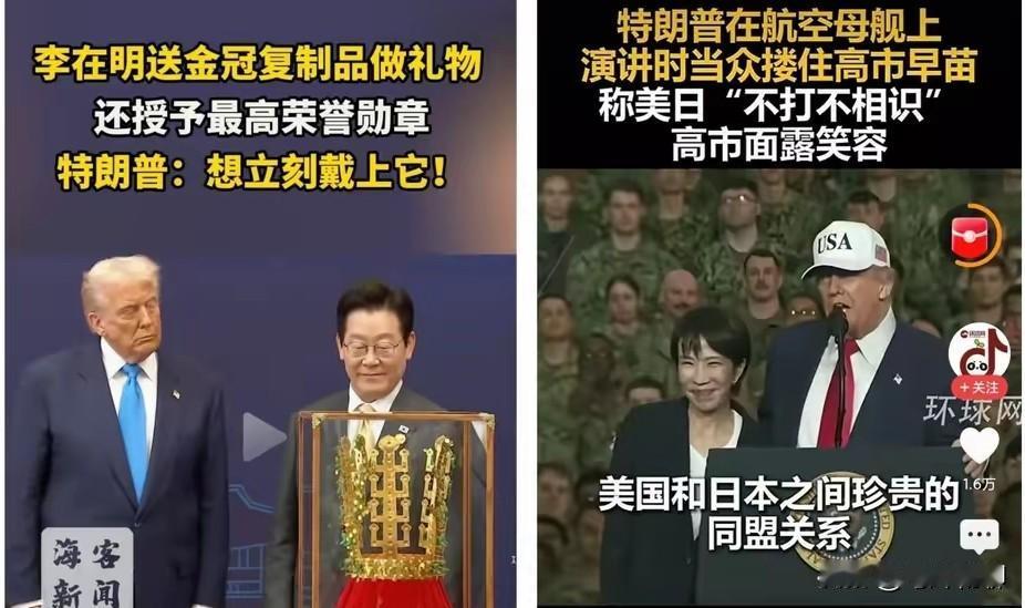 对于本次的东亚日韩之行,特朗普估计还是比较满意的。光从日韩两国接待的场面就能看出,两国领导人还是花了不少心思,均使出浑身解数来逢迎特朗普。你日本高市送棒球杆,那我大韩民国就送复制金冠。不得不说,这看着就像一场激烈的争宠大赛,两雄争“爸”,看谁能得到特朗普的青睐。 在他们看来,和美国搞好关系,就意味着以后在全球事务中将会拥有更大的发言权!可对特朗普而言,从日韩如何弄来更多的好处,才是他最关心的!(图片来自网络)聊特朗普 聊特朗普 特朗普外交突袭 日本特朗普 特朗普外访 特朗普碰壁 特朗普外交危机 特朗普韩国