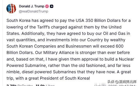 各取所需!韩国向美国支付3500亿美元,川普同意为韩国建造一艘核潜艇。 “韩国已同意向美国支付 3500亿美元,以降低美国对其征收的关税。 此外,他们还同意大量购买我们的石油和天然气,韩国富裕企业和商人对美国的投资将超过6000亿美元。 我们的军事联盟比以往任何时候都更加牢固,基于此,我已批准他们建造一艘核动力潜艇,而不是他们现在使用的那些老式、灵活性差得多的柴油潜艇。 这是一次非常成功的访问,与一位伟大的韩国总统!”