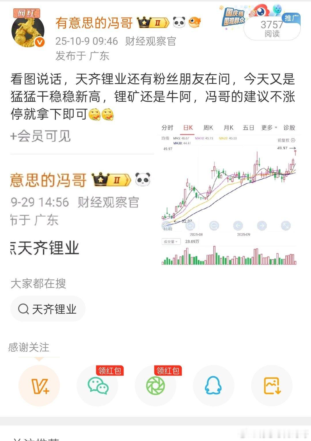 天齐锂业还是牛阿,一段期间没关注又是新高了,好的票从来不怕调整,太给力了[吃瓜]