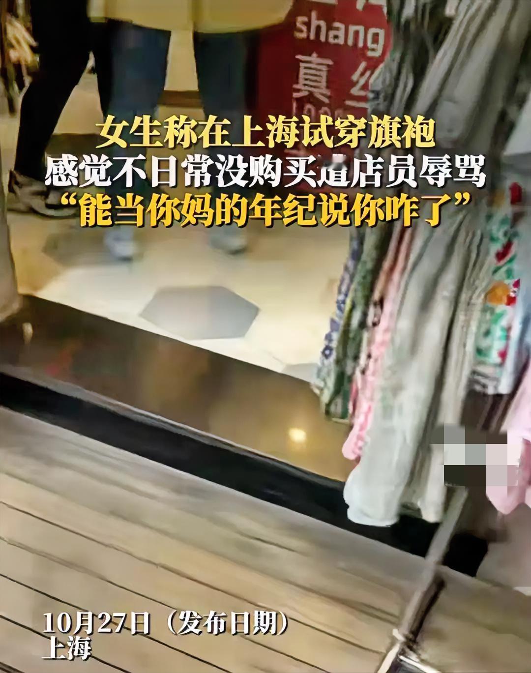 女子在上海旅游试穿一件旗袍后,觉得不合适没购买被店员辱骂:“有人生没人养的东西,我年纪都能当你妈了,说你几句怎么了。”当事人小余称,自己和朋友去上海玩,我朋友想着从来没穿过旗袍,就想进店试一下,如果合适就买了,只试了一件,觉得不喜欢,就跟商家说不买了。然后,那店员突然来一句:“如果有人说你是有爹生没娘养的,你不会生气吗?”我听到这句话就火了,就拿起手机录像,跟这店员说:“有本事你再说一遍。”那店员就来抢我的手机,抢完后又说:“我年纪都能当你妈了,说你几句怎么了?”