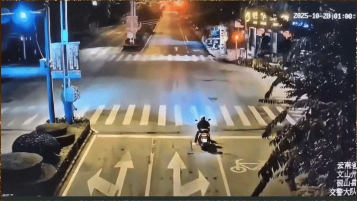 摩托车司机吓着了,但也相对镇定,换成别人还不见得咋样。 10月28日凌晨1点多,在云南某县某路段发生一起闯红灯事故。 摩托车手占右侧车道,等红灯时一辆小轿车从左侧车道箭速“飞”过,与一辆正常行驶的两轮车相撞。 肇事车过路口未见有刹车,两轮车空中转体至少三圈,疑似落地散架。 遵守交规,文明出行,要不然亲人两行泪加自己两行泪都不够啊!