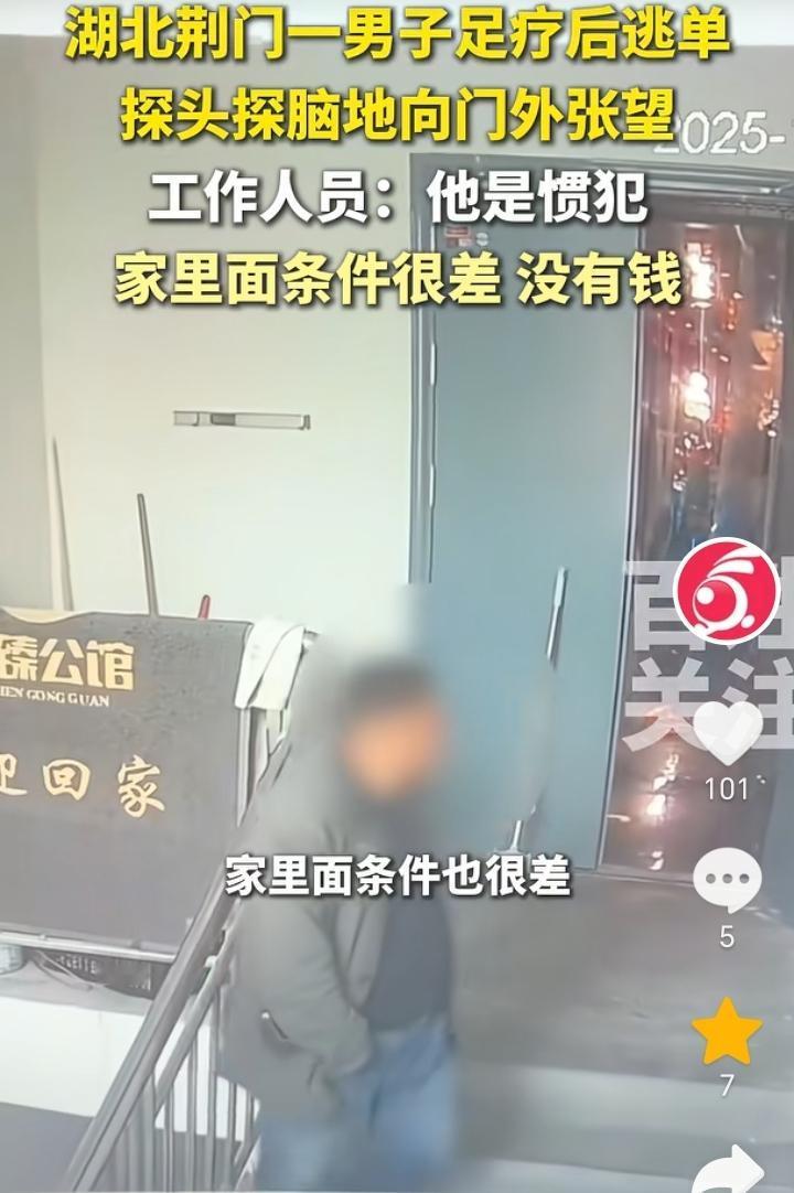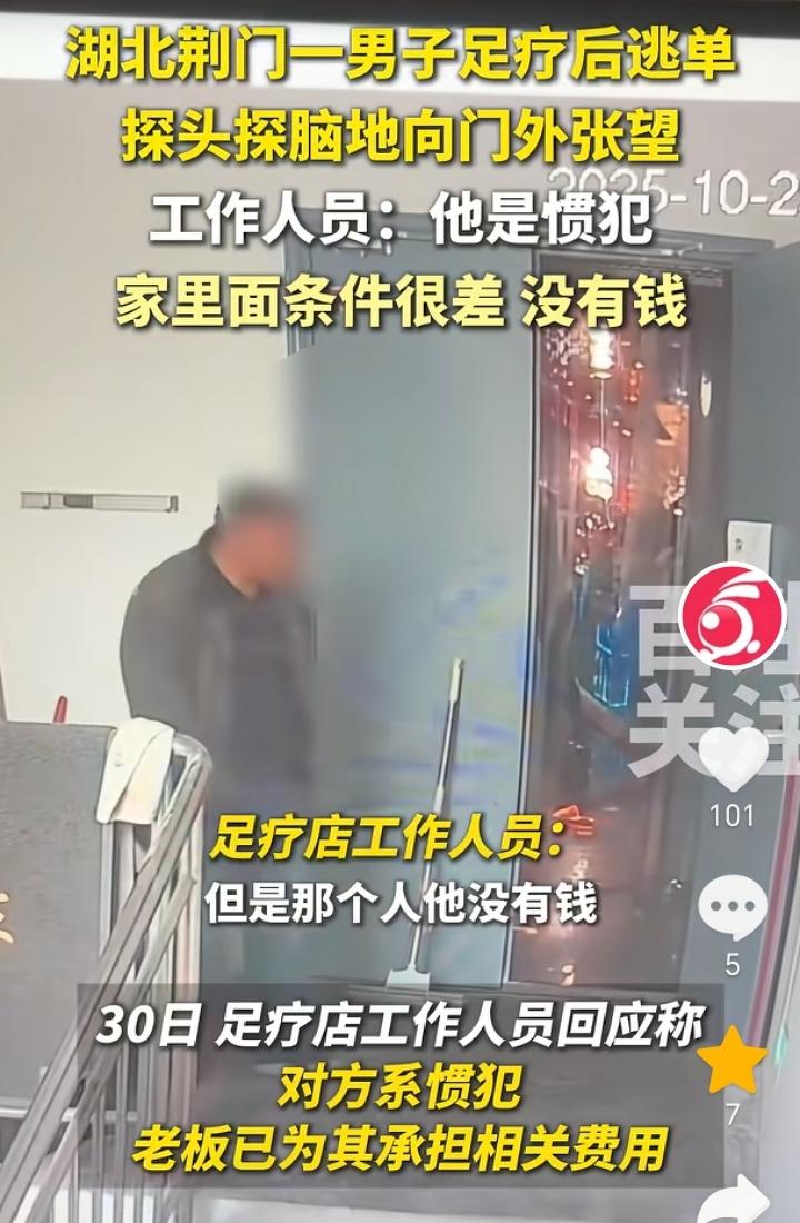 白嫖成功了?湖北荆门,一男子做完足疗未买单,然后偷偷的从消防通道探头探脑的观察没有人发现后迅速逃离。 足疗店工作人员称,报警了,但是那个人没有钱,他是一个惯犯,家里条件也很差,所以我们老板自己把单买了。 家里条件差自己也没钱,这种情况下男子还去足疗店享受,由此可见男子分明就是抱着白嫖的心理去的,他在去足疗店前就没有打算付钱,结果没想到还让白嫖成功了,老板自己买了单,虽然这样等于是纵容了男子,但是男子没钱也是没办法,不过为了避免男子再次白嫖应该曝光他,这样也能让其他商家看到这人有所防备。对此,大家觉得呢?