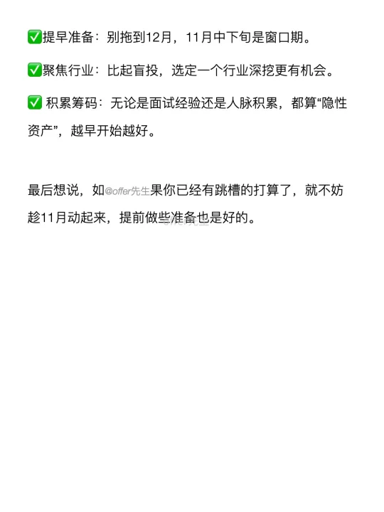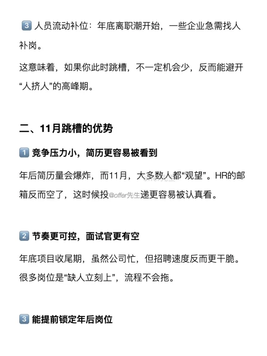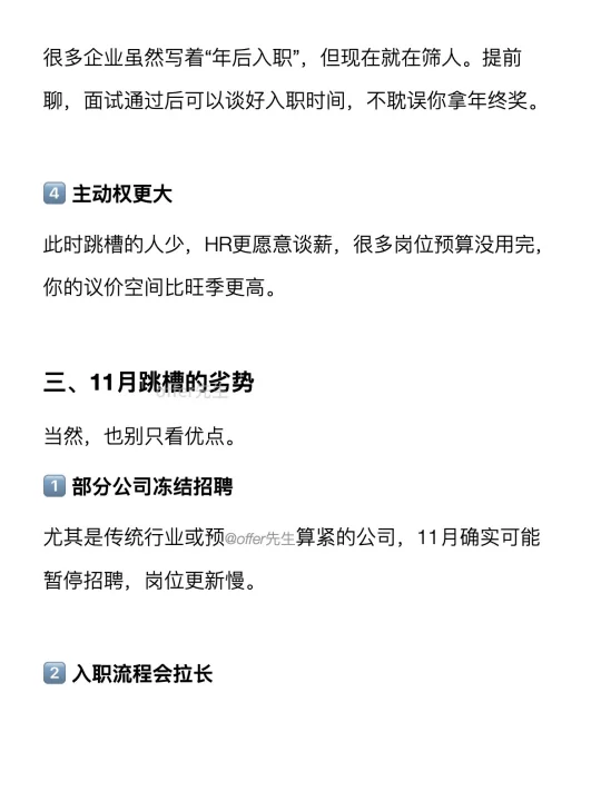 每年到11月,很多人都会纠结一个问题:“现在跳槽是不是太晚了?等明年开春再换会不会更好?” . 这确实是个现实问题,因为11月正处在一个尴尬的节点:一年到头了想变动一下,但年终奖又还没发... . 👉🏻今天就想具体拆一下:11月跳槽的利与弊,以及如果想在11月跳槽怎么在这个时间点做准备。 . 坚持日更✊🏻,帮大家在找工作路上顺利拿到offer! .