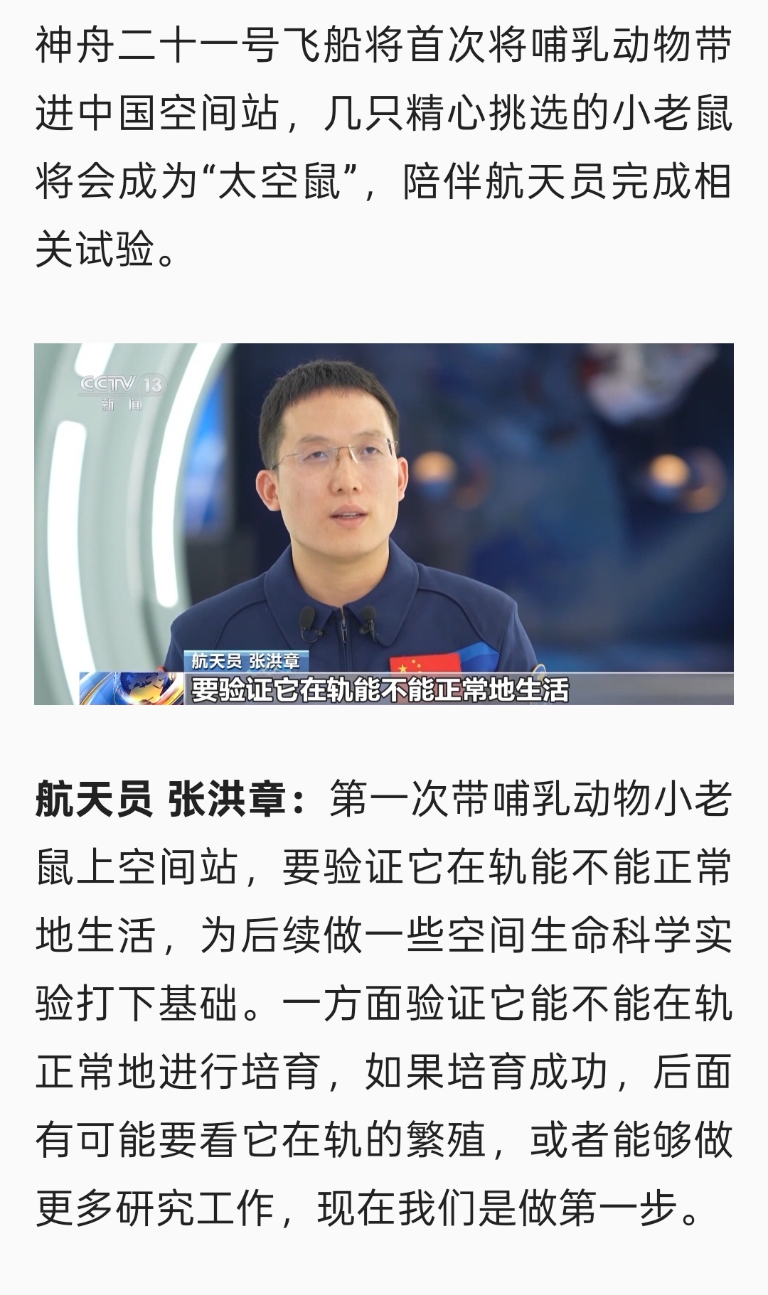 神舟二十一号 太空鼠鼠将在空间站进行繁殖实验
