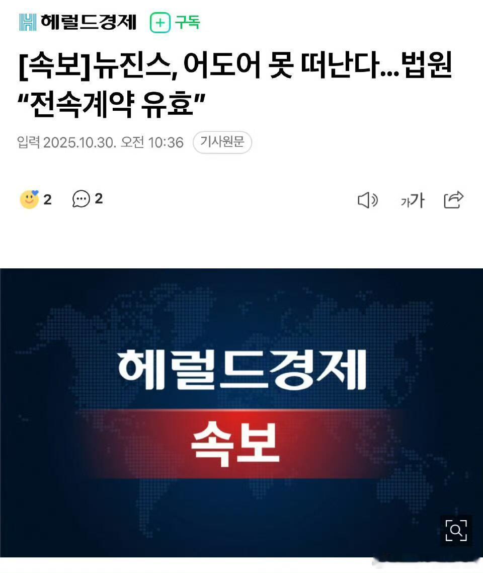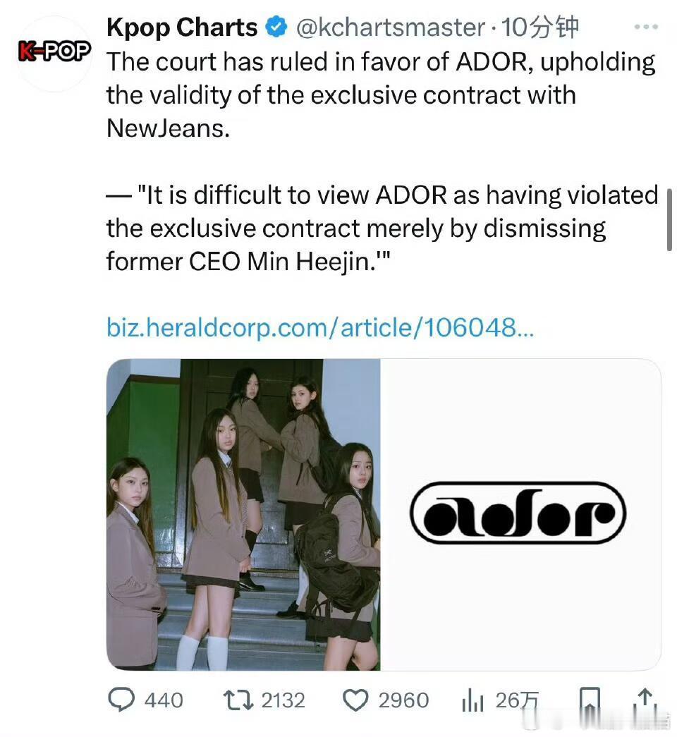 法院已裁定 ADOR 胜诉,维持了与 NewJeans 签订的独家合同的有效性。