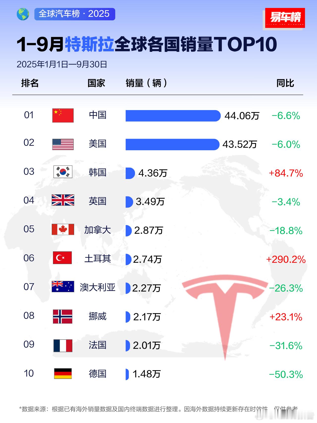 2025年9月及1-9月特斯拉全球各国销量TOP10