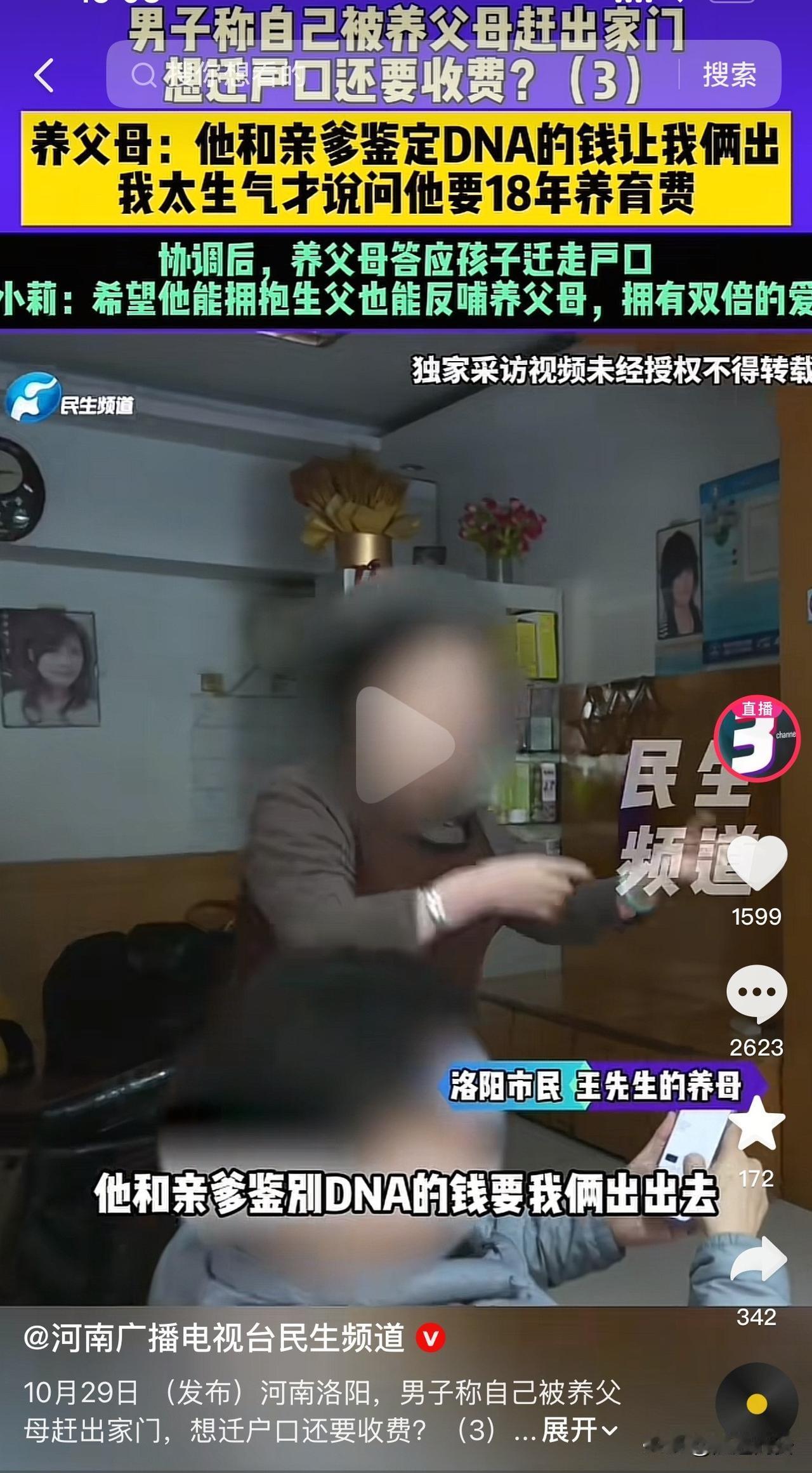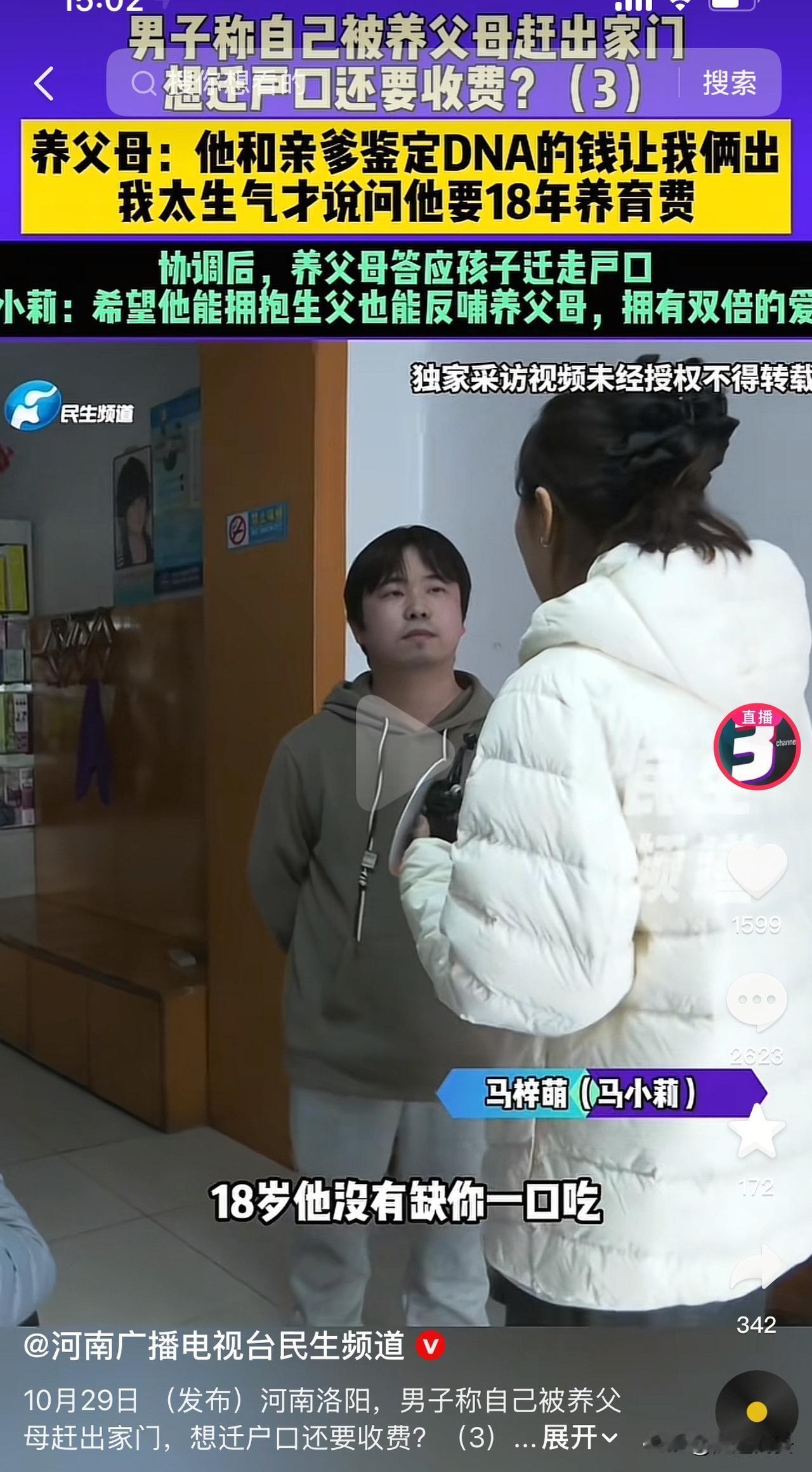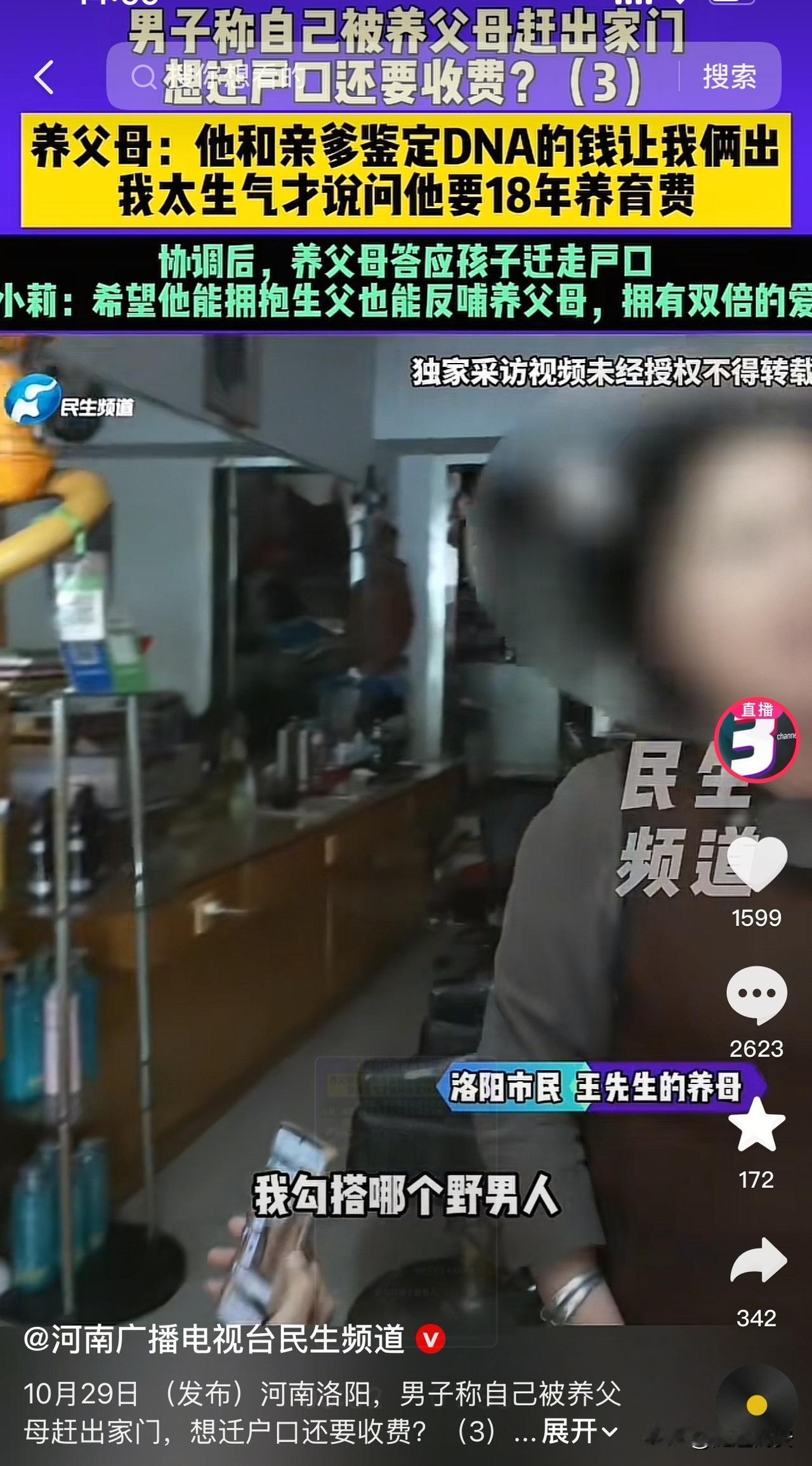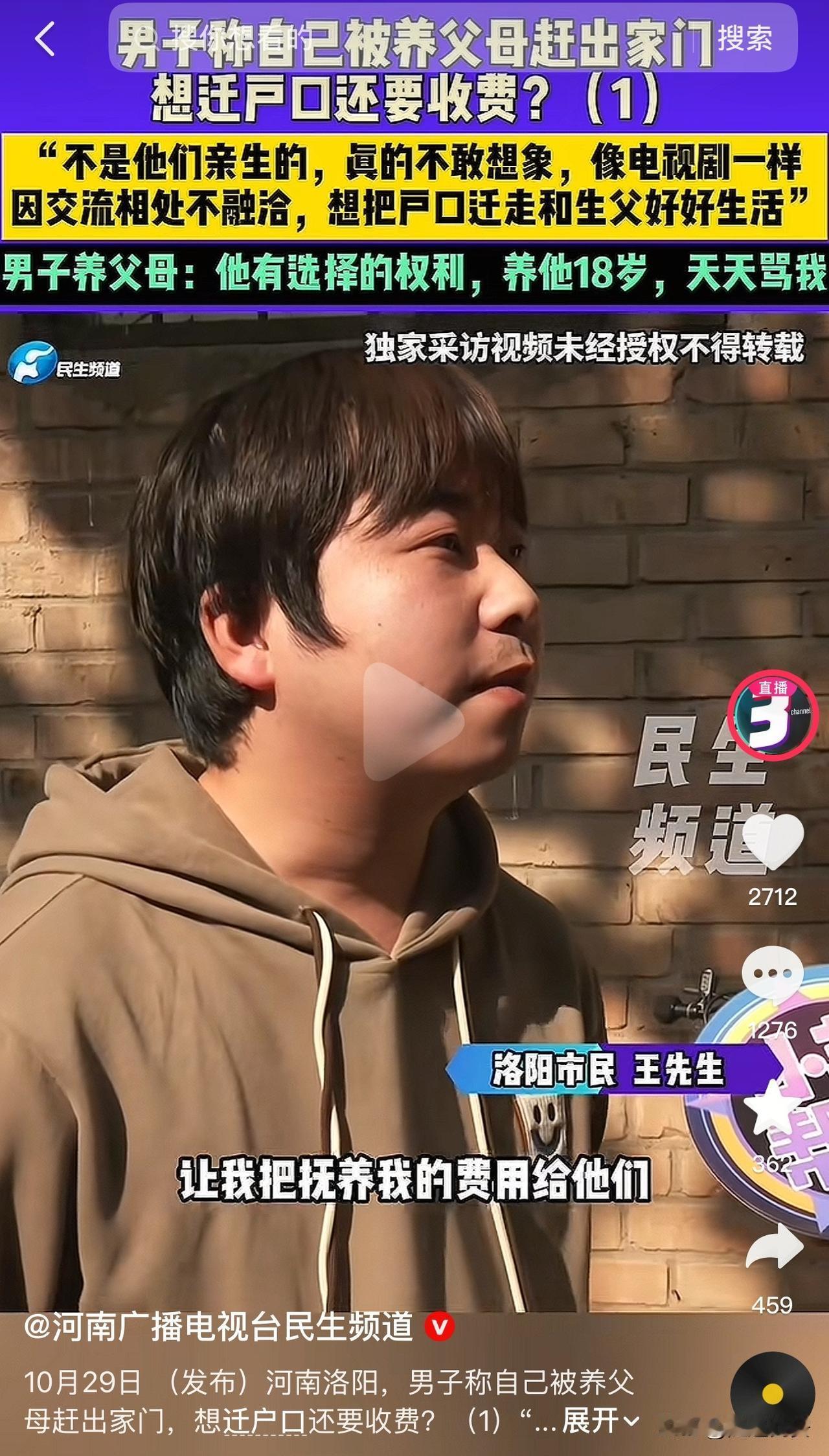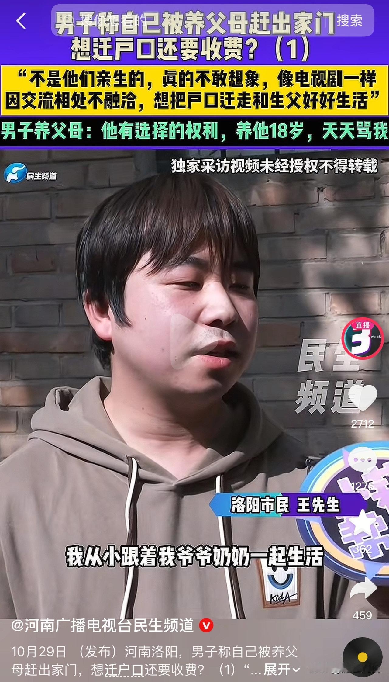 太寒心!河南洛阳一男子称自己被养父母赶出家门,找到亲生父亲后,想迁户口却被告知要收费,他不想给钱,称是跟爷爷奶奶长大的,养父母对他不仅不闻不问,还虐待他,对此,养父母却是另一番说辞。 某天,该男子和养父母再次发生口角,养母非常生气,同时也告诉他一个实情,他是被抱养来的,给了他一个当年中间人的联系方式,称你去找你亲生父母吧。 男子当时也被震惊到了,没想到电视剧里的剧情发生到了他的身上,他想着反正跟养父母关系也不融洽,那就去找亲生父母,跟他们一起生活。 费尽一番周折,他还真把亲生父亲找到了,对方想让他把户口迁回来,和他好好生活。 然而令男子没想到的是,养父母不仅阻止他迁户口,还向他索要这18年来的养育费。 这让他十分气恼,他想起来这十几年都是跟着爷爷奶奶生活的,养父母对自己不仅不上心,还时不时的打自己,为何要给他们出钱? 为此,他找到记者,希望对方能帮助自己顺利迁户口。 记者带着该男子来到养父母家了解情况,不料养父母却是另一番说辞,让记者听完都忍不住大声呵斥他。 养父母在记者面前争先恐后的数落着男子的问题,称男子找到亲生父亲后,天天骂他们。 通过养父提供的短信能看到,该男子骂养父为“畜生”,气得养父晚上都睡不着觉。 而他对养母更狠,不知感恩就算了,还到处散播养母的谣言。 养母开了个理发店,他在里面干了几天,遇到顾客来做头发,他就说这家用差药水给他做头发,把头发都烫糊了,以此来搅黄生意。 养母平时喜欢跳舞发视频,他就到视频底下评论,称“这女人四处勾搭野男人,还是个奸商……”,把养母气的差点进医院,她没想到自己辛苦养育的孩子,会这么辱骂自己,虽然他经常跟在公婆身边,但是养育费自己一分也没少。 记者转头询问男子,这个账号是否是他的,男子一口否定。 养母则表示肯定是他的,记者再次追问,男子才小声回应,是自己的。 这时,记者也没惯着他,直言不讳道:你这已经不是不懂事了,而是不尊重! 该男子解释道,自己是精神受刺激了才这么说的,因为他们虐待我。 养母说他跟女儿打架,我们没偏没倚都揍了,孩子气我,我教育他们很正常啊! 记者又问,之前是不是说过要让他把养育的钱还回来? 养父表示,他之前敲我几千块钱竹杠。 养母说,养子找到亲生父亲后,需要做dna鉴定,结果他让我们出这个钱,自己当时很生气,才会口不则言让他出养育费。 养父母称养育了18年的孩子,要迁户口也不忍心让其马上迁走,想让彼此在冷静冷静,反思反思,所以才没有同意马上让他迁走,没想到他是这样一个人。 最后,在记者的调解下,养父母已经同意让其迁走户口。 人们常说:养恩大于生恩。 而这个男子就是典型的忘恩负义之人,自己的亲生父亲因为某种原因把他送给了养父母,养父母这18年好吃好喝的养育他,到头来却换来了肆意妄为的谩骂,造谣,败坏养父母的名声,我觉得养父母给他要点抚养费也是应该的! 朋友们,你们觉得呢?