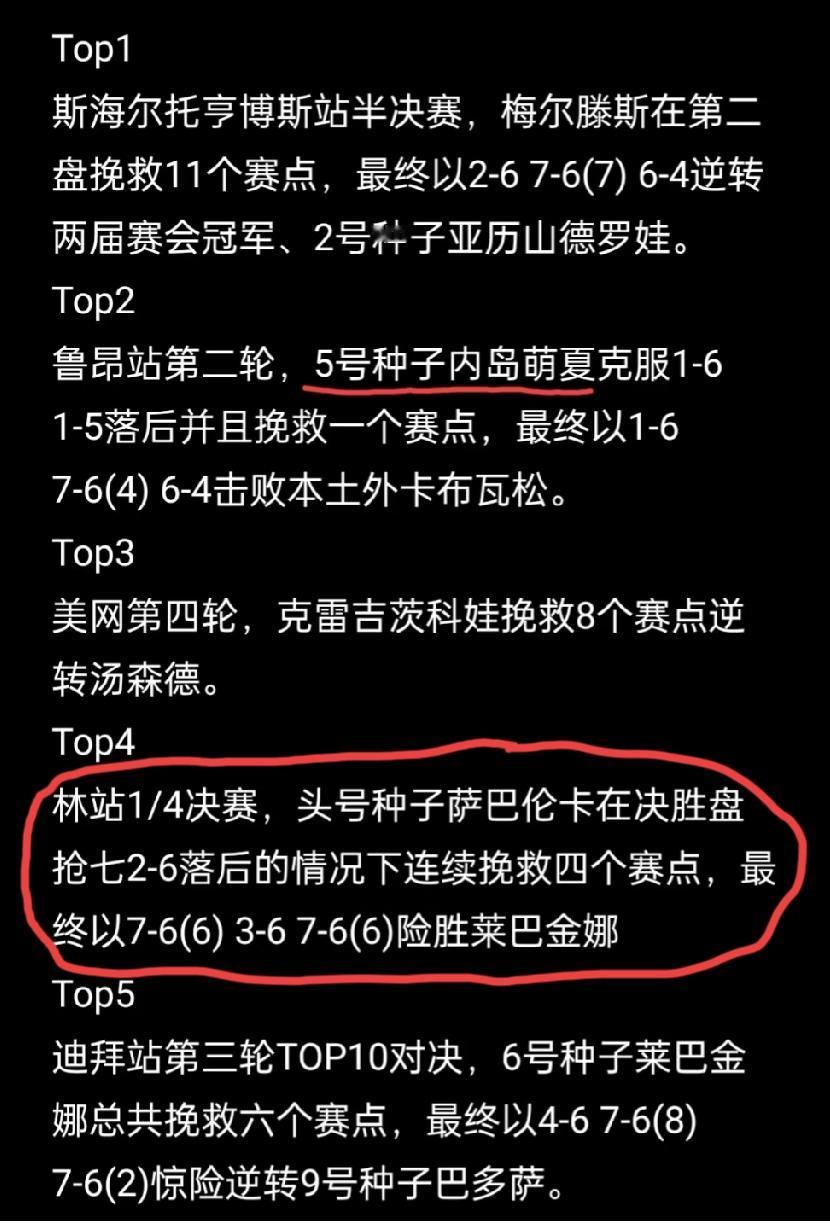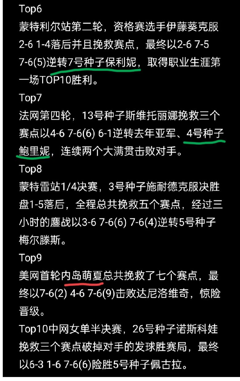 WTA本赛季十大逆转好戏,哪一场让你印象最深刻?哪一场你觉得是最可惜的? 纵观这10场比赛,我们发觉一个有趣的现象。日本球员内岛萌夏有两次上演了逆转好戏,堪称“逆转之王”。而保利尼保总,则是比较悲催的那一位,两次被对手逆转。分别是蒙特利尔第二轮被伊藤葵逆转,法网第四轮被斯维托丽娜逆转。 本赛季WtA还有年终大戏即将上演,不知道莱巴基娜有没有机会复仇萨巴伦卡。柏林站上被萨巴伦卡连追四个赛点并最终逆转成功,在莱巴职业生涯中可能也是永远抹不去的伤痛吧!