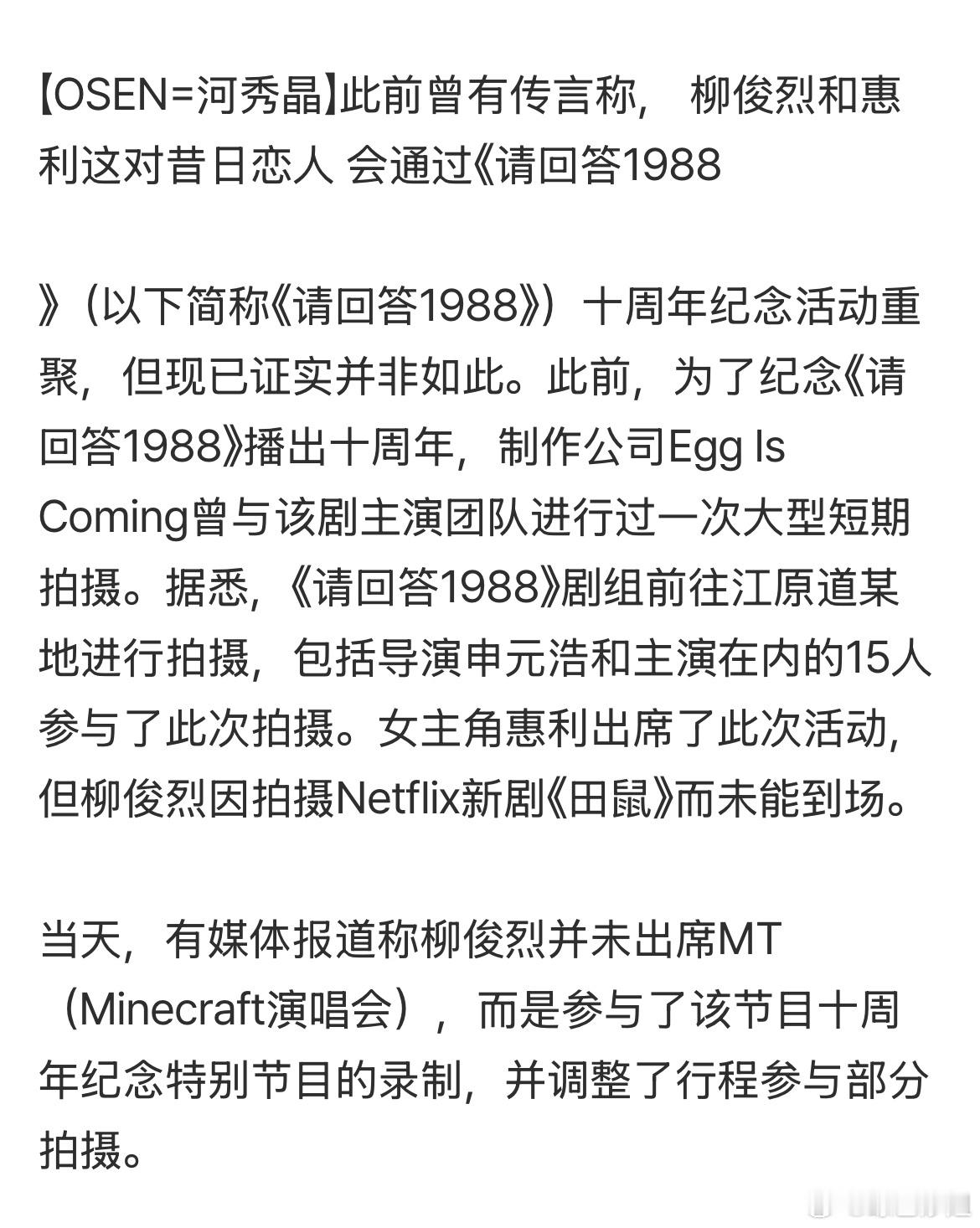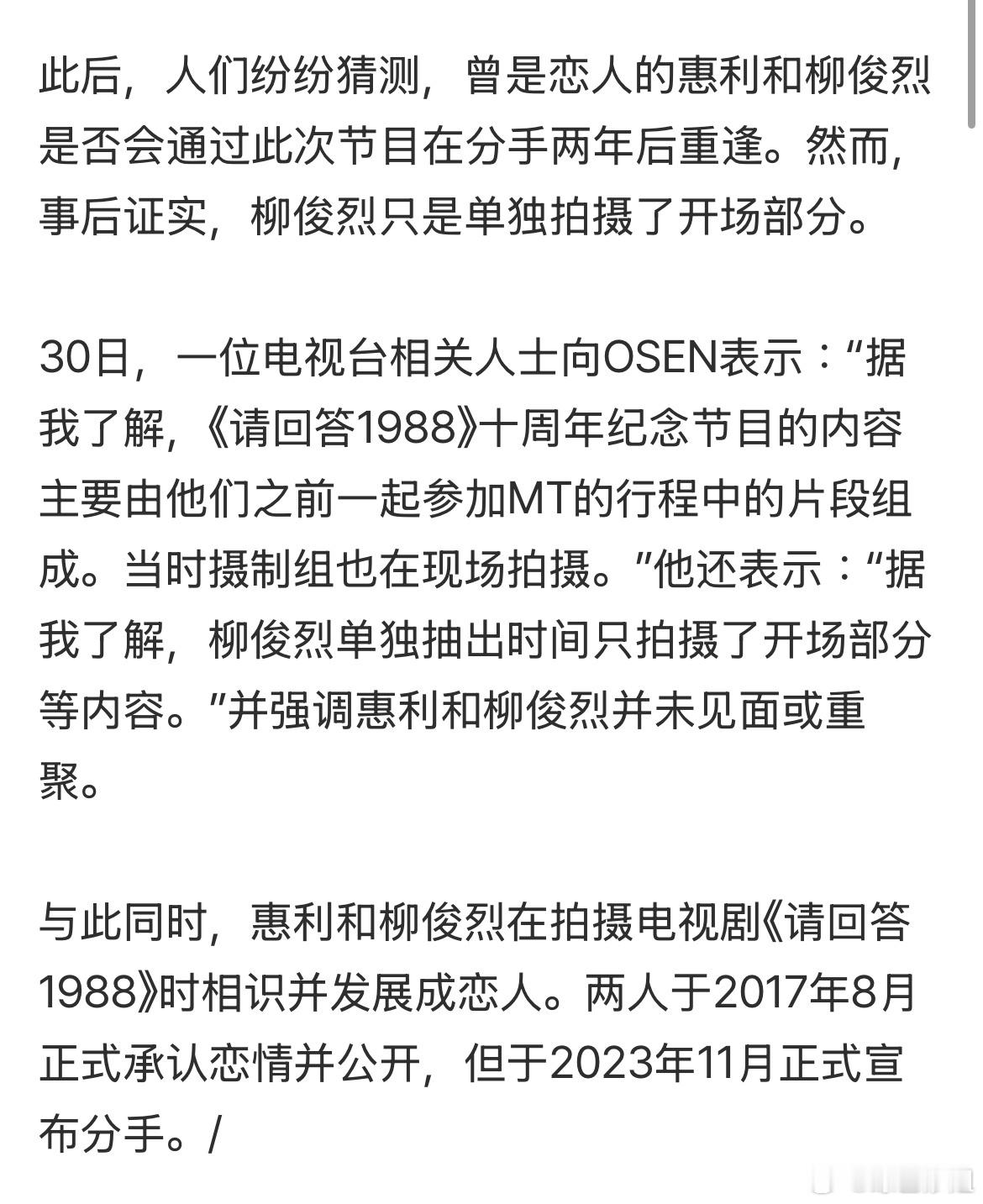 电视台相关人士称柳俊烈只参与了团综的部分拍摄,并强调他和李惠利没有见面或重聚,所以不会合体了[好运连连]