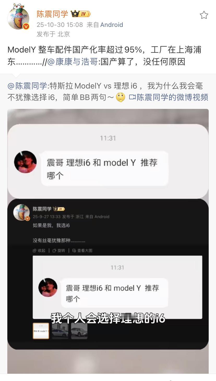 陈震:特斯拉也是国产车! ModelY 整车配件国产化率超过95%,工厂在上海浦东。 网友:国产的算了,没有任何原因。 现在也有很多人有其他眼光看待国产车,实际上小编能理解这些人是什么样的心情,但凡在10年前买过国产车或者20年前买过国产车,大家就明白怎么回事了。 以前国产车真的除了价格便宜一些,其他很多方面确实不如合资的车。现在但凡是价格做的比较到位的车型,基本上用料都是非常不错的。