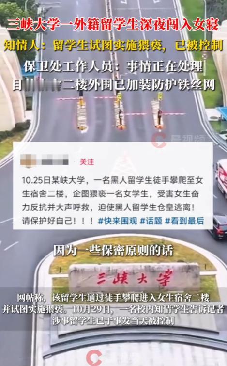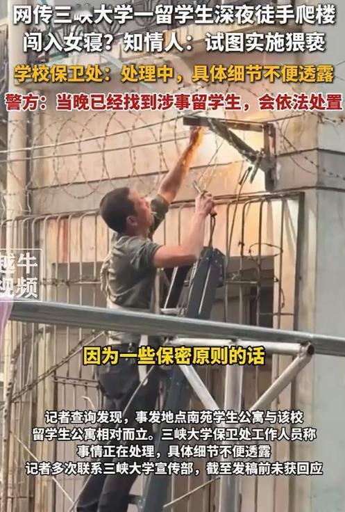 连夜装了铁丝网!10月25日,湖北宜昌,一位女生在学校宿舍睡觉,睡着睡着感觉有人摸自己,她睁眼一看,竟是个外国留学生,不知道怎么偷偷溜了进来。 10月25日,湖北宜昌某高校女生宿舍,一名外籍留学生竟然徒手攀爬外墙,偷偷潜入女生宿舍楼,对熟睡中的女大学生实施骚扰。 当时正值深夜宿舍里静悄悄的,女生们都已经进入梦乡,受害女生迷迷糊糊中感觉有人在触碰自己,起初还以为是做梦或者室友不小心碰到,等她稍微清醒一点借着微弱的光线一看,床边竟然站着一个陌生男子的身影。 这一刻恐惧瞬间涌上心头,但这位女生展现出了超乎寻常的勇气和冷静,她没有被吓得不知所措而是立即大声呼救:有人,抓贼,声音划破了宁静的夜晚,整个楼道都被惊醒了。 见事情败露这名外籍男子转身就想逃跑,可女生并没有让他轻易得逞,她一把抓住对方的衣服,两人在走廊里发生了激烈的拉扯,其他宿舍的女生听到动静,纷纷开门查看有人赶紧去叫宿管,有人拿起手机准备报警。 宿管阿姨接到消息后以最快的速度赶到现场,看到这一幕她二话不说就拨打了110报警,很快警察就赶到了学校,将这名外籍留学生当场控制住。 经过调查这名留学生是通过攀爬宿舍楼外墙进入的,虽然女生宿舍不在一楼,但由于外墙有一些凸起的装饰和管道给了他可乘之机,这也暴露出学校在安全防护方面存在的漏洞。 事件发生后学校的反应速度让人称赞,第二天一早学校就召开紧急会议,对这起恶劣事件进行处理,校方态度明确:零容忍,当天就宣布开除这名外籍留学生取消其学籍,并配合警方进行调查。 同时学校连夜组织施工队伍,对所有女生宿舍楼的外墙进行全面检查和加固,工人们通宵达旦,在宿舍楼外安装了密密麻麻的防护网和铁丝网,确保不留任何安全死角,监控设备也进行了升级,增加了夜间巡逻的频次。 警方的处理同样雷厉风行,根据相关法律规定,这名外籍留学生的行为已经构成违法,警方依法对其进行了刑事拘留,按照程序他不仅要接受法律制裁,还将面临被驱逐出境的处罚,并且在相当长的时间内被禁止入境。 这件事在网上引发了广泛讨论,很多人为这位勇敢的女生点赞,她的果断反应不仅保护了自己,也为其他女生敲响了警钟,同时学校和警方的快速处理也得到了肯定,证明了在维护学生安全这件事上,没有任何妥协的余地。 这个案例给所有外籍人员上了一课,在中国的土地上,必须遵守中国的法律,不管你来自哪里什么身份违法就要付出代价,这种公平公正的处理方式才是真正的法治精神。 这起事件也提醒各高校安全工作永远不能松懈,除了加强硬件设施,还要完善管理制度,加强安全教育,让每个学生都有自我保护的意识和能力。 中国的大学校园不是法外之地,任何违法犯罪行为都将受到严惩,保护学生安全,维护校园秩序这是底线也是红线谁都不能触碰。 麻烦看官老爷们右上角点击一下“关注”,既方便您进行讨论和分享,又能给您带来不一样的参与感,感谢您的支持!