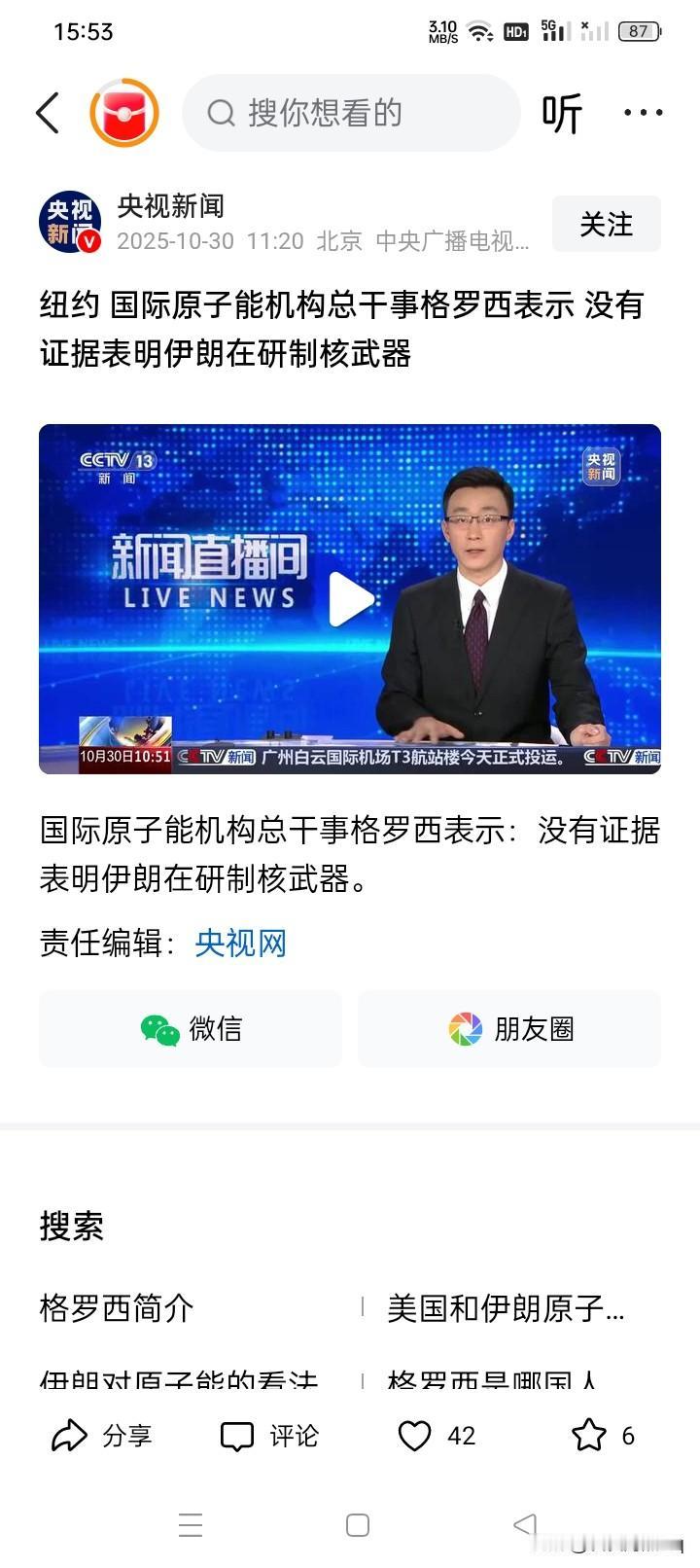 实际上也是真的! 伊朗研制核武器的问题,一直是以色列、美囯及差不多所有的国家迈不过去的坎,是一场可能是最严肃的斗争。有消息说,最近,国际原子能机构总干事格罗西表示:没有证据证明伊朗在研制核武器。 在以色列对伊朗的情报渗透几乎达到无孔不入的程度,以及以色列和美国的战斗机想怎么空袭伊朗就怎么空袭伊朗的情况下,是个人都会考虑研制核武器的结果和后果。 伊朗如果积极研制核武器,无疑就是作茧自缚,自寻死路。