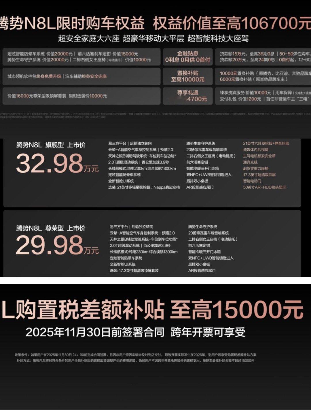 家庭出行选车难题有解了!大六座安全豪华SUV腾势N8L正式上市,两款车型指导价29.98万-32.98万元,直接瞄准高端家庭出行需求。