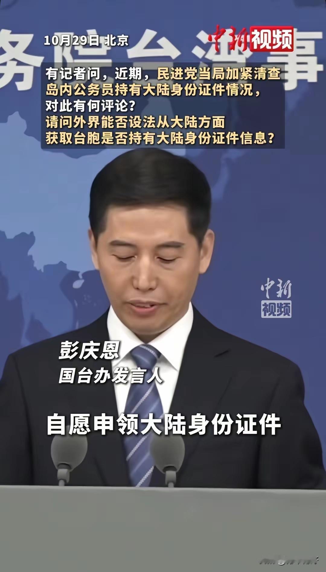 台湾急了!台湾急了! 国台办发言人最新发言: 台湾居民自愿申领大陆身份证,是其享有合法的权利。我要再次强调,台胞申领大陆各类证件情况及证件信息,受到有关部门严格保护,外界无法获取!这番回应让岛内炸锅——民进党炒作的"泄密恐慌"彻底穿帮,自己反倒成了笑话。 谁能想到,一张大陆证件竟让民进党如临大敌。从3月查公教人员,到8月放话2026年起核心岗位人员持大陆证件就丢工作,再到近期的"抄家式"清查,民进党把"绿色恐怖"玩得淋漓尽致。更可笑的是,他们一边造谣"申领有风险",一边拿不出任何证据,反倒是赖清德被网友扒出疑似持有福建泉州发的大陆身份证,真假难辨却引全网嘲讽。 大陆这边早就把便利做到了实处。台胞领的身份证是18位编码,背后印着长城和国徽,坐高铁、办社保、买房子都能一证通用。截至2025年初,已有超20万台胞拿到大陆证件,不少台湾青年直言"办事再也不卡壳,这才是一家人的感觉"。更关键的是,这些信息受法律严格保护,民进党想查也查不到,纯属白费力气。 民进党真正怕的根本不是"信息泄露",而是怕台胞亲身感受到大陆的善意。要知道福建、广东等地早就给台胞备好了创业补贴、住房优惠,越来越多台湾人在大陆扎根发展,"抗中谋独"的谎言自然不攻自破。就像国台办说的,这些证件"有用、实用、好用",民进党再怎么威胁恐吓,也挡不住两岸同胞走近走亲的脚步 。 现在岛内网友都在调侃:"民进党查来查去,不如想想怎么解决民生问题"。你觉得这波清查闹剧会就此收场吗?评论区聊聊!