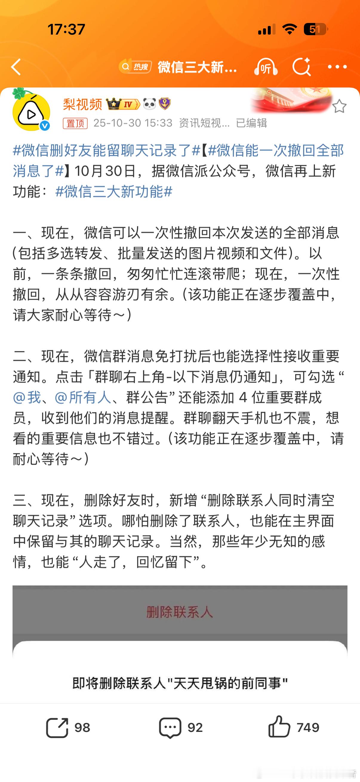 微信三大新功能 微信现在的更新感觉还可以,有些内容还是不错的。这个删除好友可以留下聊天记录,我觉得挺有用的,关键时刻能保留一些证据。大家觉得,微信还需要更新哪些内容?