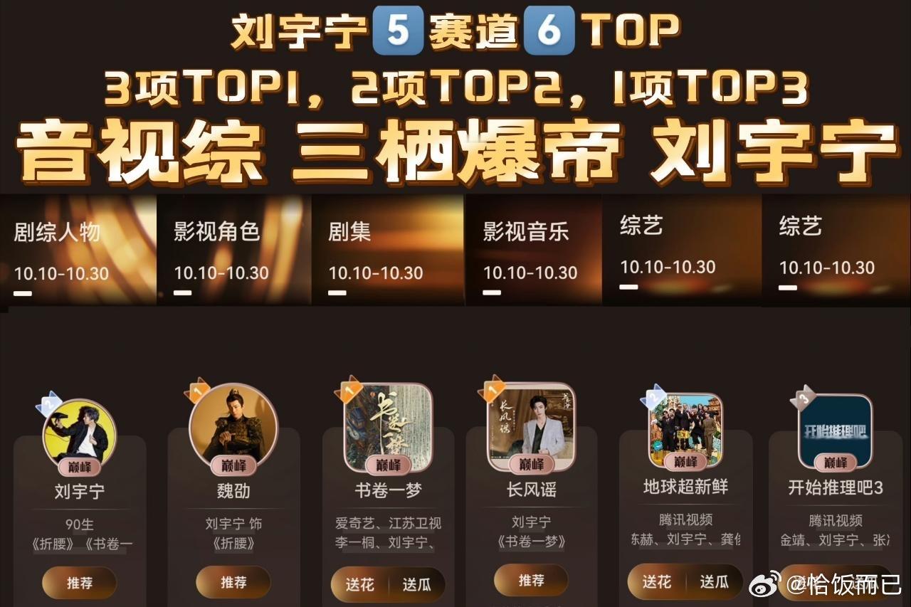 刘宇宁微博视界大会5️⃣赛道6️⃣项TOP强势引领圆满收官!角色魏劭 剧集书卷一梦 歌曲长风谣 斩获第一1️⃣!收割年度巅峰人物!就这个音视综三栖爆帝爽!刘宇宁微博视界大会