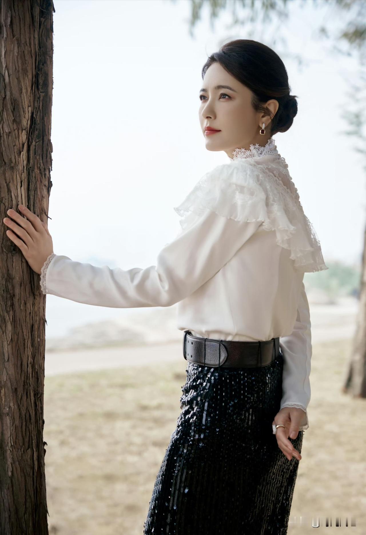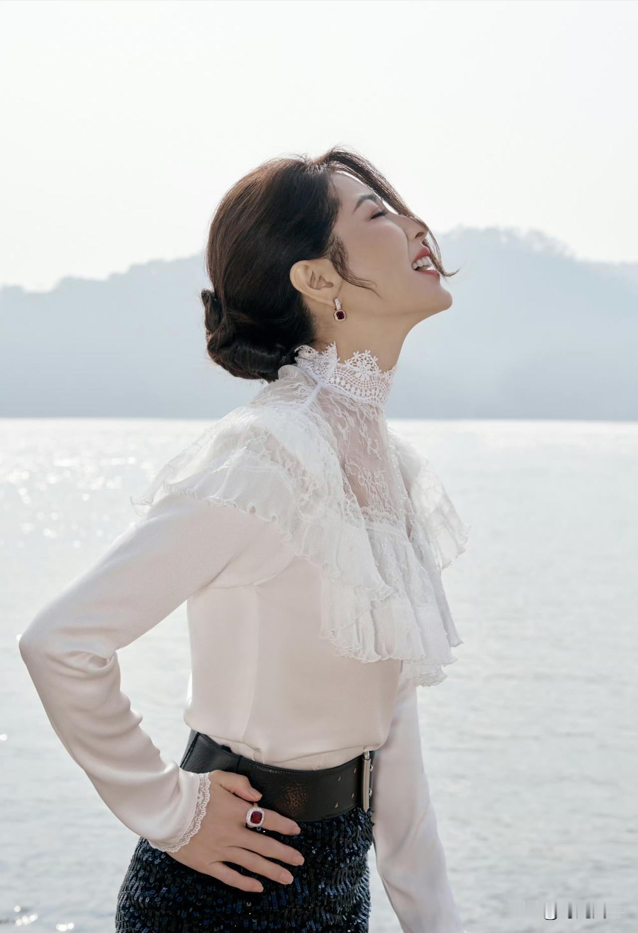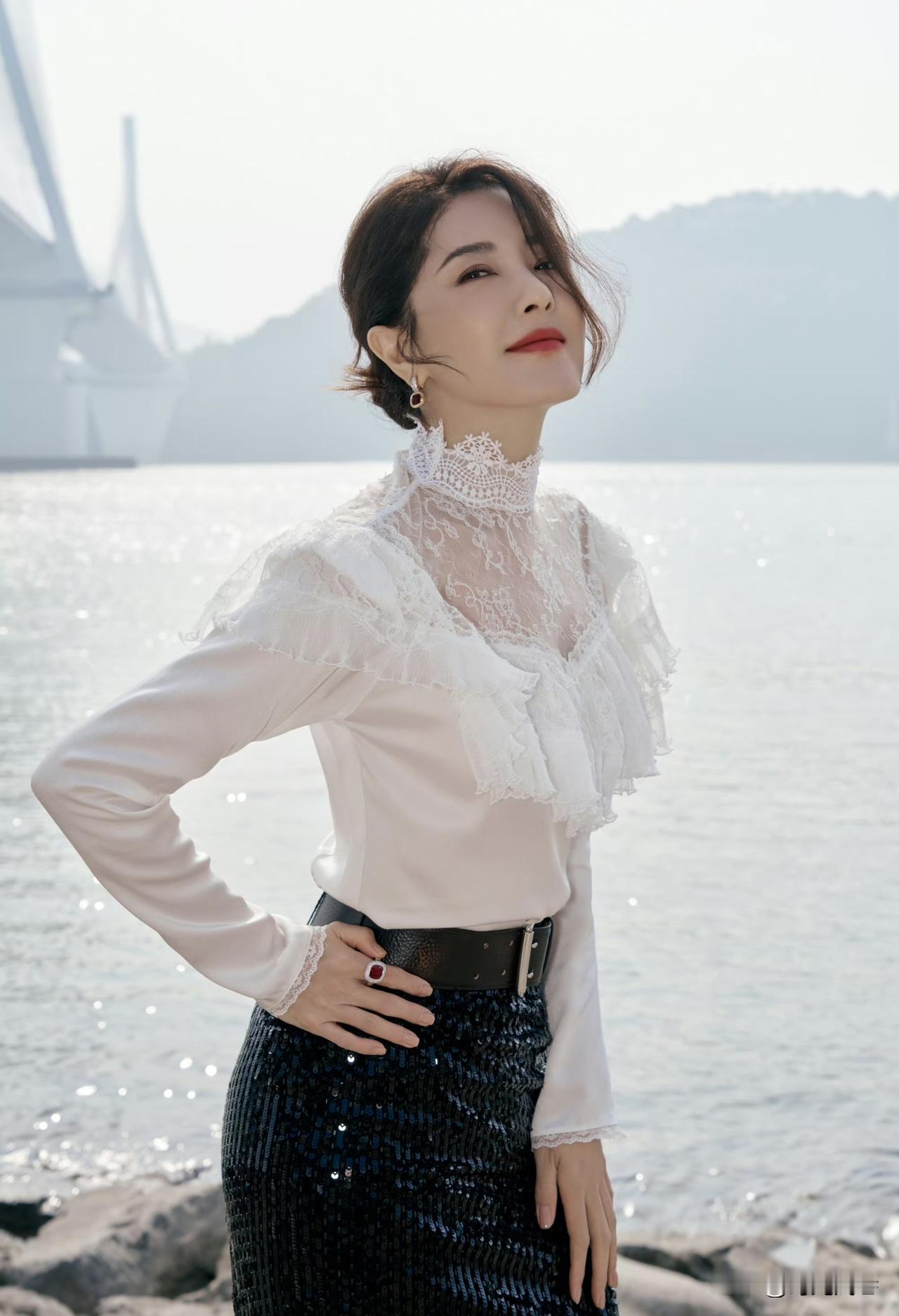 回到家乡在长江边拍照的曾黎,白衣打配黑裙。成熟稳重,优雅迷人。曾黎冻龄秘诀