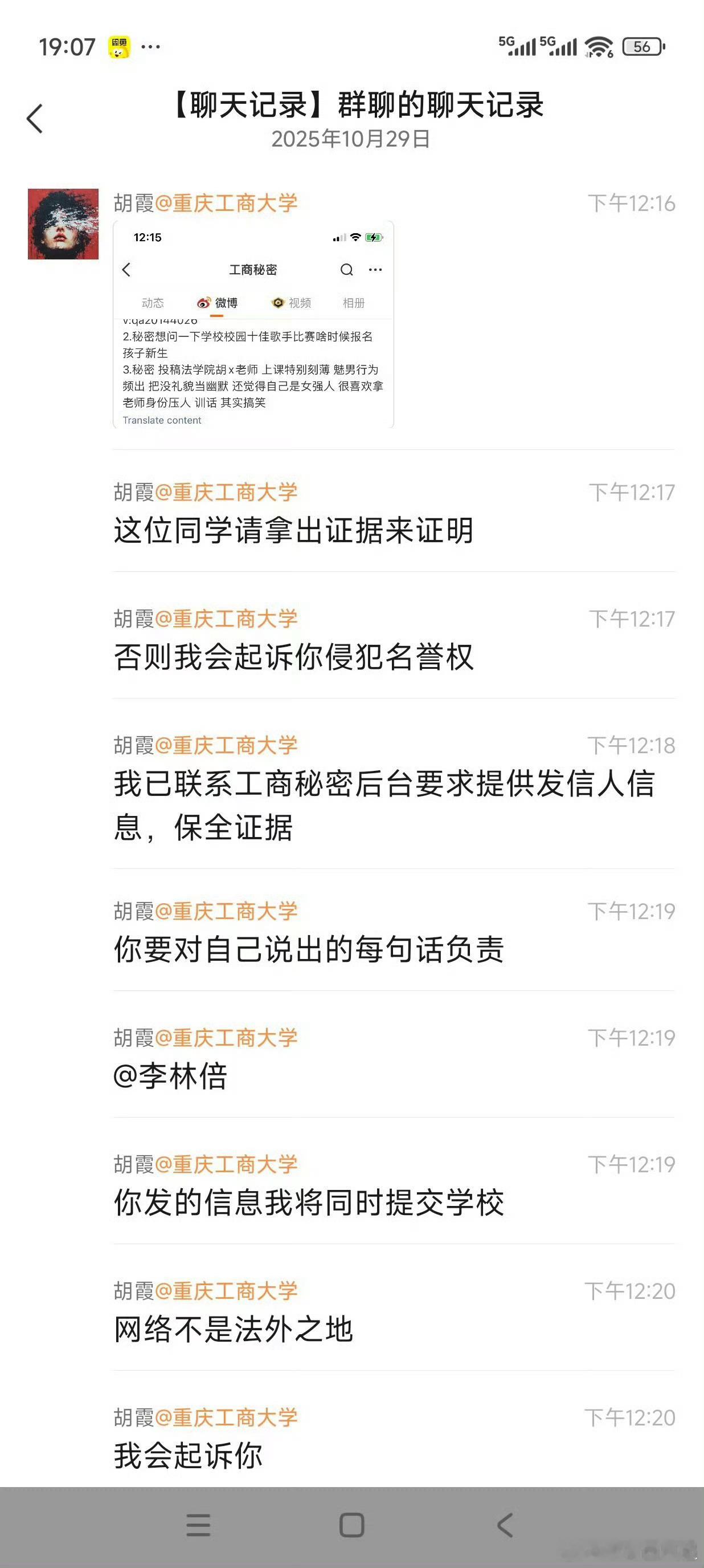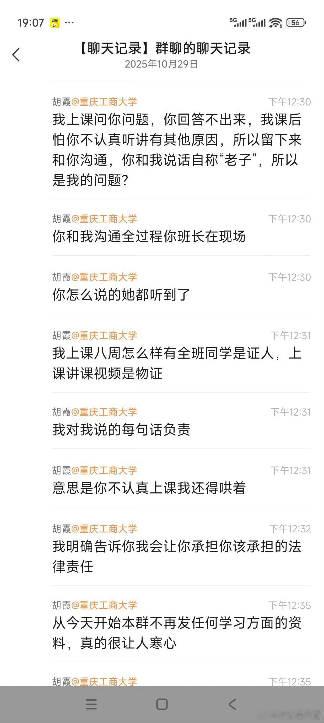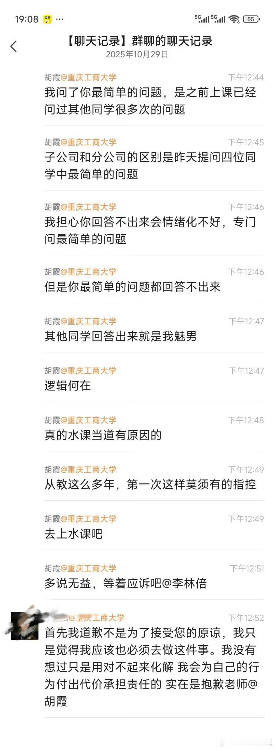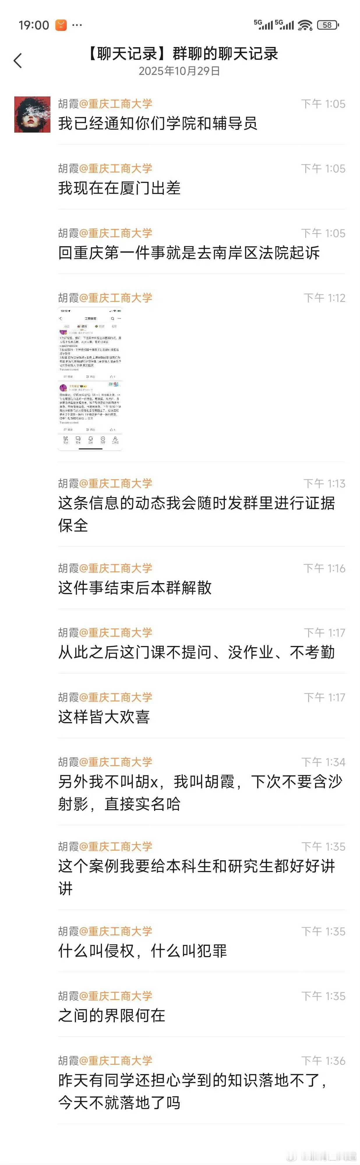 10月28日,重庆工商大学一名女生在课堂上没有回答出老师提问的问题,随后在社交平台投诉该老师“刻薄、媚男”。涉事老师知晓后在学生群内表示要起诉该女生。