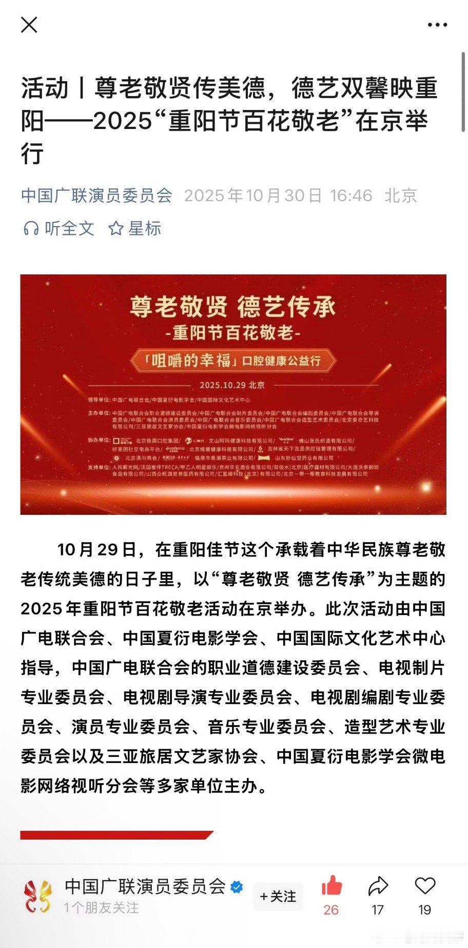 中国广联演员委员会发布是由广电等联合会承办的项目,特意提了邀请angelababy参加重阳敬老活动,真的不错[手指比心] ​​​