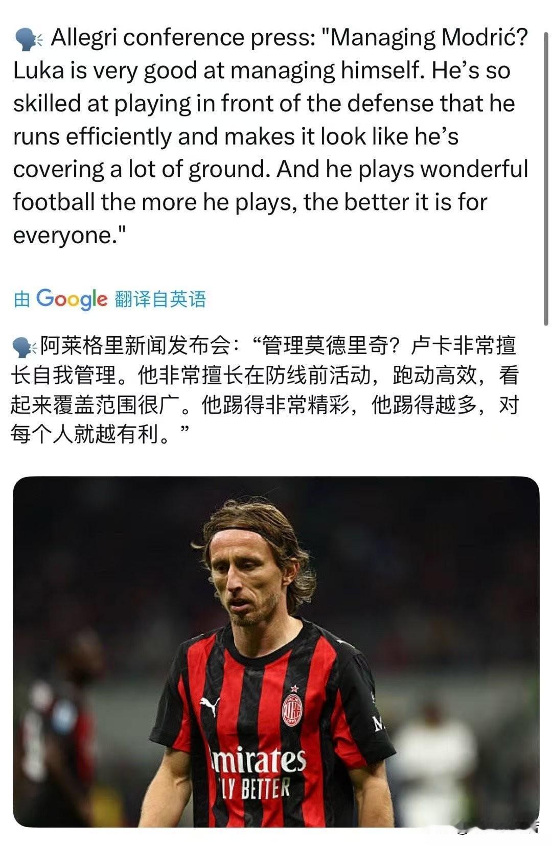 莫德里奇!阿莱格里谈到莫德里奇说我没有对莫德里奇提出过任何要求,他一直都是自我管