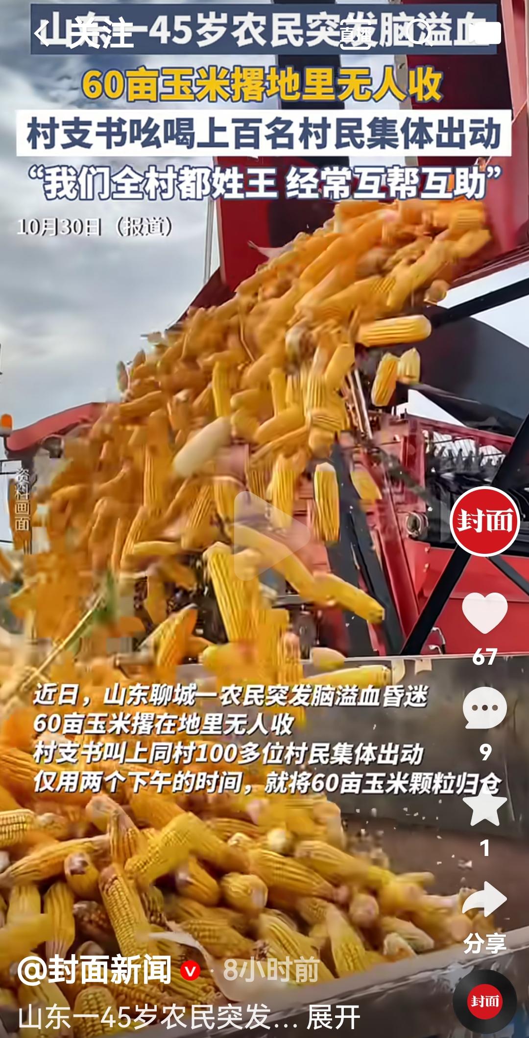 山东一45岁大叔突发脑溢血,60亩地玉米无法收,村支书召集村里上百人帮忙收玉米 根据媒体报道,近日山东聊城一农民因为突发脑溢血,自己地里有60亩玉米仅仅收了10多亩还有40亩没有收,村支书了解情况后召集村里上百人帮忙收玉米 仅仅用了两个下午就把剩余的玉米颗粒归仓 看到这就想起以前农村干活都是这样,因为每个家里的农具都不齐全,劳动力也不多就几家联合起来,一家一家的收,以前主要用牛,后来有机拖拉机那就快多了,这样场面现在很少见了 真的是感谢帮忙啊,农民最怕的就是到了农忙时自己家粮食收不到屋农村亲人去世 老年人离世 大爷住院 脑溢血死亡 大爷摔伤致死 图片来自封面新闻视频