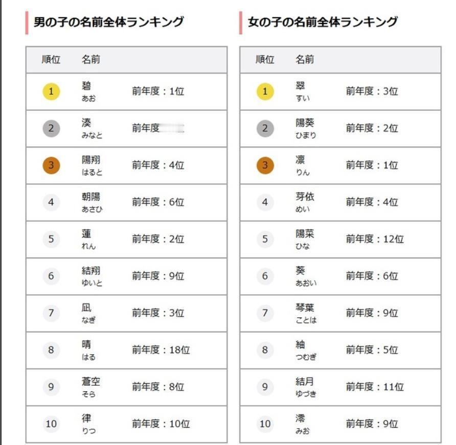 受日本国脚田中碧影响?日本2025年新生儿名字排行榜出炉:“碧”“翠”位居榜首 日本知名教育机构贝内塞公司(Benesse Corporation,总部位于冈山市北区)近日发布了《2025年新生儿名字排行榜》。该榜单基于2025年1月至9月期间出生的约16.6万名新生儿的名字数据统计而成。 男孩名字榜首:“碧”连续两年夺冠 女孩名字榜首:“翠”首次登顶 根据贝内塞公布的调查结果,2025年最受欢迎的男孩名字是“碧”(主要读音:Aoi),这是该名字连续第二年位居男宝名字榜首。而最受欢迎的女孩名字则是“翠”(主要读音:Suī),首次跃居女宝名字第一位。 名字趋势:自然意象受青睐,简洁短名成主流 调查显示,近年来父母在为孩子取名时,更倾向于选择富有自然意境、简洁易记的名字。 在男孩名字中,带有“天空”“光明”等积极意象的名称人气上升。例如,“朝阳”(Asahi)从去年的第6位升至第4位,“晴”(Haru)也从去年的第18位大幅上升至第8位,反映出家长希望孩子拥有明朗、阳光未来的美好愿望。 女孩名字方面,“阳”字因传递温暖、明亮的感觉而备受青睐。例如,“阳菜”(Hina)从去年的第12位上升至第5位,成为热门之选。 此外,单字名和两字短名的数量明显增加,显示出当代父母更偏好简洁、现代且富有美感的名字风格。 调查样本来源与规模 本次调查统计了2025年1月1日至9月15日期间出生的婴儿名字,数据来源于使用贝内塞旗下孕期育儿杂志《TAMAGO CLUB》(たまご俱乐部)和《HIYOKO CLUB》(ひよこ俱乐部)相关产品与服务的用户反馈,总计样本数达166,011个,其中包括男孩83,839人,女孩82,172人。 该排行榜每年发布一次,被视为反映日本社会文化与审美趋势的重要参考。