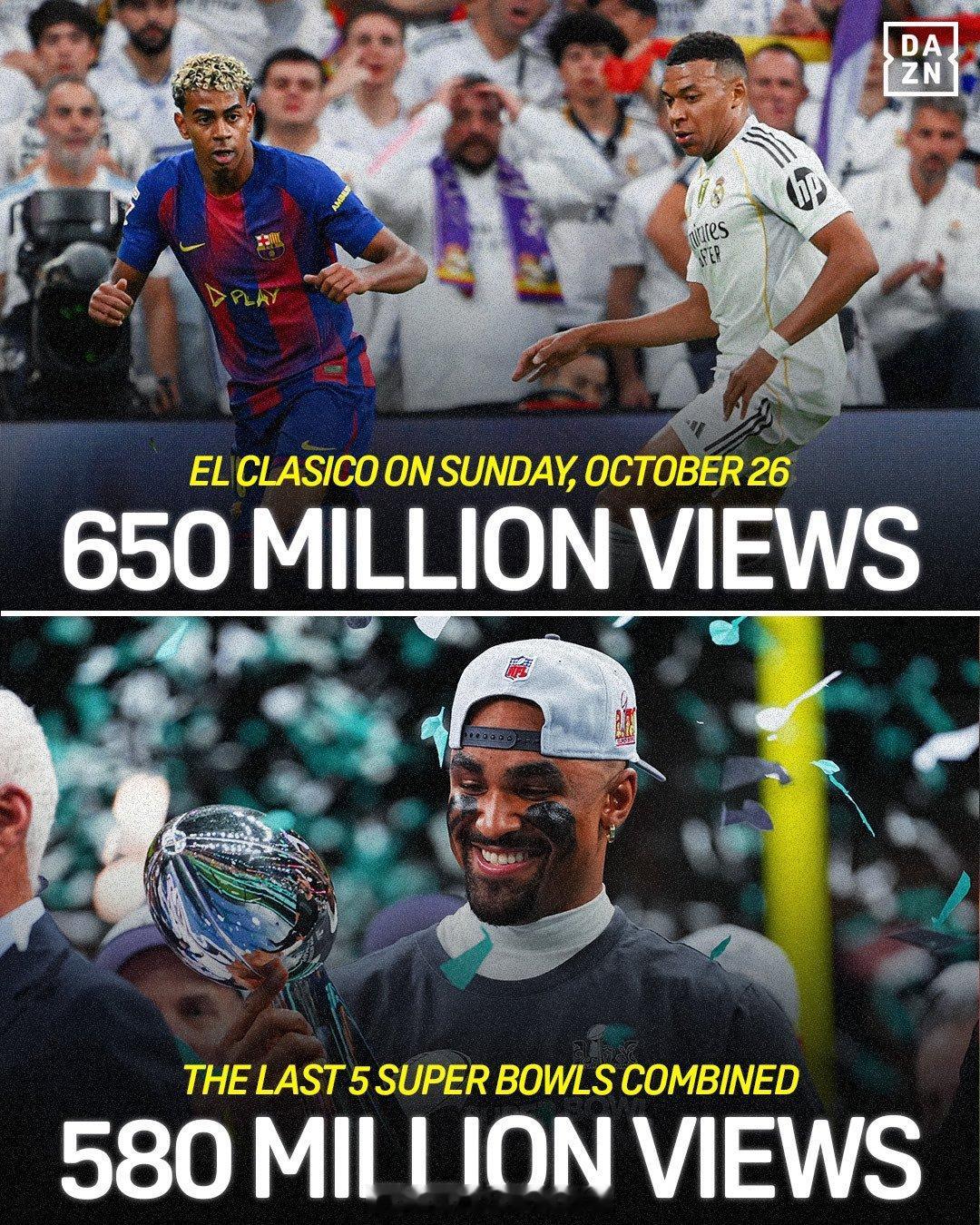 【足球才是第一运动】DAZN消息:上周末的西班牙国家德比,皇马2比1巴萨,全球各大平台的总观看人次达到6.5亿。作为对比,过去5年的美式橄榄球NFL超级腕观看人次总和,也就是5.8亿,两项职业运动的影响力高下立判。 ​​​